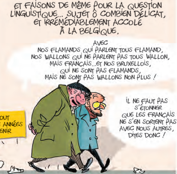On retrouve deux personnages, un vieux qui ressemble au vieux dégueulasse de Reiser et un qui ressemble à un méchant dans « Spirou et Fantasio ». Ils commentent chaque information importante avec ironie car ils connaissent bien leur pays. C’est eux qui mène la réflexion progressive dans la bd. Et à leur côté, dans un autre contexte, un homme qui ressemble à Achille Talon qui symbolise le citoyen lambda belge. Il tente de parler avec neutralité de la complexité de l’Histoire, de la politique, de la langue… C’est original de vouloir aborder le sujet en abordant l’angle que c’est le modèle qu’il faudrait pour le monde. L’avenir serait belge. Très vite, on se rend compte que c’est une façon absurde de parler de leur pays qu’ils aiment tant. Ce n’est pas leur coup d’essai puisqu’ils ont déjà deux tomes à leur actif sur comment devenir belge. La question que l’on peut se poser, c’est l’intérêt que le français peut avoir pour ce sujet. Et surtout l’image de ce pays est lié à sa culture avec le neuvième art, son architecture, sa cuisine, ses boissons… Des sujets non traités car trop consensus et qui peut d’apport critique. On n’évoque pas non plus ses humoristes qui ont souvent du succès hors frontière. Mais peut-être Gilles Dal et Fred Jannin n’y voyaient aucun intérêt puisque ce sont eux les amuseurs. Du moins, on le croit, la réalité est tout autre. On voit les blagues, on comprend les sous-entendus et cela ne fait pas tout. Rire est une activité agréable qui n’a pas été pratiquée ici. Le dessin est un peu grossier, non abouti n’aide pas non plus. On aimerait être emporté dans ce système assez singulier qu’il soit politique ou linguistique. Néanmoins, peut-être que le public ciblé reste très particulier, surement ceux qui déjà comprennent le mot brol.