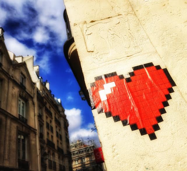 Je ne sais pas qui a fait ce joli cœur, mais à Strasbourg, nous avons un spécialiste des collages pixel « cigogne » : https://blogoth67.wordpress.com/tag/stork/ et https://www.instagram.com/stork_pixelart/?hl=fr et aussi https://strasbourg.streetartmap.eu/recherche/stork