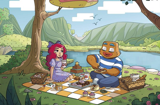 Après le succès des aventures de « Frigiel et Fluffy », l’éditeur Soleil contacte le youtuber Superbrioche pour lui proposer de faire une bd. Au début, cela avait commencer avec Minecraft puis doucement cela a évolué vers autre chose. Le projet a bien évolué en 2 ans. Toutefois, on va y voir des clins d’oeil avec un peu l’univers cubique mais pas d’épée, de combat… On va suivre l’aventure d’un bonhomme en pain d’épice qui doit partir en quête culinaire pour améliorer ces compétences et découvrir de nouvelles saveurs. Un sujet pas si novateur, on retrouve des choses semblables dans le manga « Artiste. Une chef d’exception » de Taro Samoedoou le comics « Space Battle Lunchtime » de Natalie Riess. Mais par contre, à la collaboration du scénario on a une personne très populaire et très suivi sur les réseaux sociaux. La vraie plume est Jean-Christophe Derrien qui est habitué à ce genre d’histoire puisqu’il raconte aussi « Frigiel et Fluffy » et « Siphadventure ». Il change un peu de style car il parle de gourmandise et d’addiction. Est-ce une façon d’alerter les jeunes lecteurs de faire attention? Une fois que l’on commence à en manger, c’est difficile de s’arrêter. Certains vont jusqu’à dire que le sucre c’est comme la cocaïne. On devient accro. Du côté graphique, on découvre le travail de Rosa La Barbera qui fait quelque chose de très jolie esthétiquement. Surtout quand on est dans le monde des bonbons avec des choses assez rondes, chaleureuses et gourmandes. Et la mise en couleurs de Cécilia Giumento apporte un vrai plus avec ces teintes chaudes et réconfortantes. Cela s’affirme dès la couverture surtout avec l’effet brillant. Est-ce une mise en appétit?