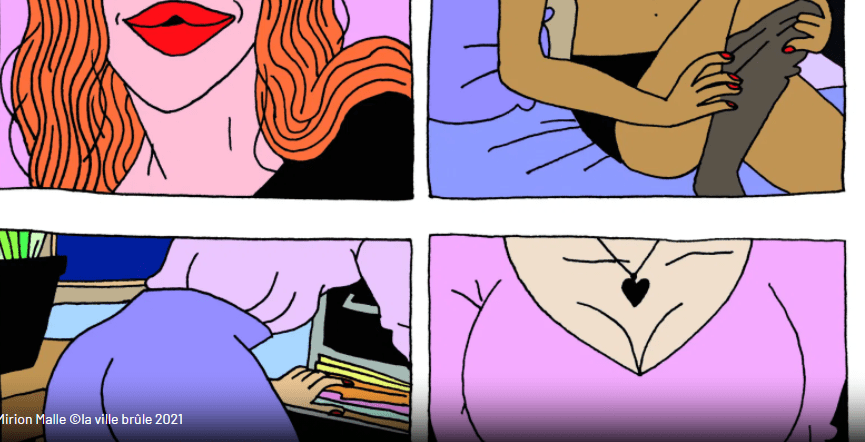 On ne parle pas ou ne montre pas les règles qui pourtant occupent une grande partie de la vie d’une femme. On voit peu de femmes qui n’ont pas d’enfants par choix, de vrais amitiés ou des couples qui ne sont pas hétérosexuels. On va éviter de parler de la diversité car cela prendrait trop de temps. Par contre, on peut évoquer les ravages du porno. C’est 12 ans l’âge moyen du premier visionnage du porno. Qu’est-ce qu’un enfant de cet âge peut comprendre à ce qu’il voit? Et dans les images, on constate encore des hommes qui dominent, qui violentent, qui agressent… Ils croient même que leur sperme à des pouvoirs magiques à vouloir les forcer à avaler ou étaler sur le corps. Par contre, ce n’est pas assez exceptionnel pour qu’il mange le leur. Etrange! Petit pas après petit pas, les choses changent et pour cela il faut sensibiliser, discuter, échanger tout le monde même ces messieurs vicieux et narcissique. Mirion Malle insuffle grâce à son dessin de la rébellion, de l’investissement, du peps, de la colère et de la hargne… Une artiste de conviction qui met son talent au service du féminisme et de la lutte contre le sexisme.