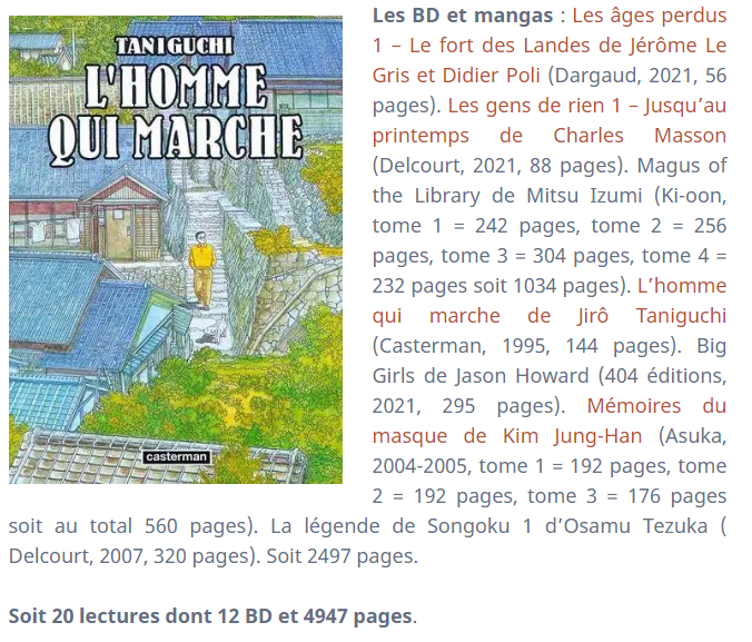 Eh bien, toutes les BD citées dans la question précédente ! Pour les BD américaines ou comics, le top est pour moi Maus d’Art Spiegelman et j’ai découvert récemment Umbrella Academy de Way, Bá et Stewart. Mais il y a aussi les séries de Spiderman et du Surfer d’argent. Je serai un peu plus explicite pour les mangas. Déjà, je conseille les auteurs classiques, bien sûr Osamu Tezuka qui a touché à tous les genres (commencez par les séries courtes, Ayako, Barbara, Dororo, L’histoire des 3 Adolf, Kirihito, MW mais tous ses titres sont très bons voire excellents), Jirô Taniguchi (Au temps de Bochan, L’homme qui marche, Le gourmet solitaire, Le journal de mon père, Quartier lointain, tous ses titres en fait) et les auteurs de gekiga comme Yoshihiro Tatsumi (Coups d’éclat, Les larmes de la bête, Une vie dans les marges), Yoshiharu Tsuge (L’homme sans talent et d’autres titres chez Cornélius), Shigeru Mura (3 rue des mystères, Kitarô le repoussant, NonNonBâ). Il y a aussi Hiroshi Hirata (et ses mangas historiques), Kazuichi Hanawa (Dans la prison) et Le bateau-usine de Gô Fujio (adapté d’un roman). Vous préférez du shôjo (manga pour filles) avec de la romance, du fantastique ou du dramatique ? Lisez Ayashi no Ceres (« conte de fée céleste », 14 tomes) ou Fruits Basket (23 tomes). Du shônen (manga pour garçons) avec de l’action, de l’aventure, du fantastique ou du quotidien ? Vous avez l’embarras du choix avec Full Metal Alchemist (27 tomes), Love Hina (14 tomes) ou Black Jack (17 tomes) pour ne pas citer les plus célèbres (Dragon Ball, One Piece, Ranma 1/2, etc., qui sont des séries très longues). Du josei (manga pour femmes) abordant des thèmes féminins voire féministes ? Tentez Nana (thème de la musique, 21 tomes), Paradise Kiss (thème de la mode, 5 tomes), Le pavillon des hommes (uchronie historique, 18 tomes) ou Complément affectif (thèmes amour, couple, 11 tomes). Du seinen (manga pour adultes) ? Essayez 20th Century Boys (22 tomes), Berserk (40 tomes), Claymore (27 tomes), Gunnm, last order (19 tomes), Monster (18 tomes), Spirit of the sun (17 tomes), Zipang (43 tomes) mais si vous préférez des séries plus courtes, misez sur Agharta (9 tomes), Last exile (3 tomes), Nausicaä de la Vallée du Vent (7 tomes), Number 5 (8 tomes). Et si vous voulez vous faire peur, n’hésitez pas avec Akira (14 tomes), L’école emportée (6 tomes) ou Baptism (4 tomes), tous deux de Kazuo Umezu, Homunculus (15 tomes), Manhole (3 tomes). Parmi les séries récentes, ciblez L’atelier des sorciers (8 tomes, en cours), Le bateau de Thésée (10 tomes), Blue Giant (10 tomes), Dodoma (3 tomes), L’enfant et le maudit (11 tomes), The Promised Neverland (17 tomes), Shadow House (6 tomes, en cours), To your Eternity (12 tomes, en cours), Tsugumi Project (3 tomes en cours), vous trouverez facilement les auteurs, et je vais m’arrêter là parce qu’il y en a encore tant et tant (et je n’ai même pas parlé des manwhas et des manhuas) ! Une dernière info, j’aime les mangas avec des chats comme Chi une vie de chat, Doraemon, Félin pour l’autre 1 de Wataru Nadatani, Le journal des chats de Junji Itô, Street Fighting Cat 1 de SP Nakatema, Le vieil homme et son chat 1 de Nekomaki ou Yanaka histoire de chats.