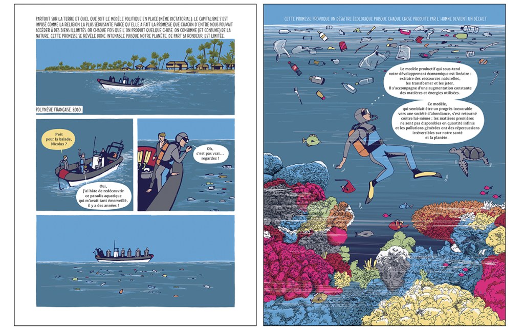 Prendre conscience du réchauffement climatique, la disparition des animaux, l’essor de la pollution en tout genre… est une noble cause. D’ailleurs, la thématique est de plus fréquente dans le 9ème art. Alors cela demande d’aborder la chose sous un angle originale si on veut toucher le public. Rustica éditions mise tout sur la réputation de l’ancien ministre. La côte de popularité de Nicolas Hulot n’a pas trop perdu de sa superbe malgré son passage aux côtés du président. Malgré quelques annonces sur la relance du nucléaire ou autres, il est perçu plutôt comme une victime. Par facile de faire des choses quand il faut flatter les lobbyistes qui financent des campagnes et qui aident à se faire élire. Parer à l’urgence, prévoir à court terme et faire plaisir à certaines personnes n’est pas pratique pour mettre en place des actions sur le long terme. Rien de nouveau sous les tropiques, la politique a toujours fonctionné ainsi. Pourquoi cela changerait en modifiant la tête pensante? Il faut être naïf pour croire cela. Cet épisode est assez bref. Tout le livre tourne autour de Nicolas Hulot. Même s’il a écrit le scénario, tout ne devait pas forcément autour de lui? Heureusement que l’on a à côté des données scientifiques, des sources, des citations…. pour le côté véridique. Faut-il comprendre qu’il est l’homme de la providence? celui qui peut vraiment changer les choses? celui qui a compris vraiment les choses et qui fait de grands pas? Côté graphique, heureusement que le nom des personnages sont données car impossible de reconnaître Nicolas Hulot, Emmanuel Macron ou les autres sinon. Le duo semble complice dans la création qui ne m’a pas convaincue. Parler d’impliquer les gens dans un combat ne nécessite pas forcément de parler de soi comme un produit miracle. Aucun doute que cette bd flatte l’égo toutefois cela ne nuit-il pas au message?