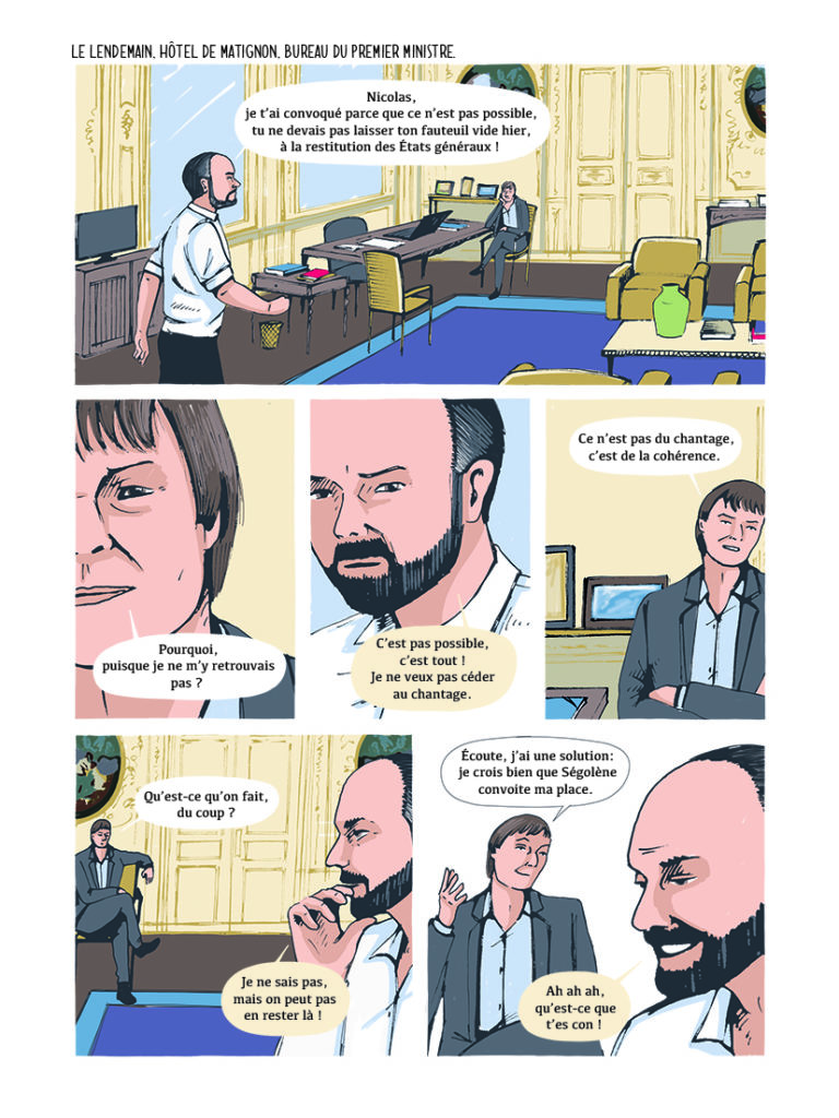 Prendre conscience du réchauffement climatique, la disparition des animaux, l’essor de la pollution en tout genre… est une noble cause. D’ailleurs, la thématique est de plus fréquente dans le 9ème art. Alors cela demande d’aborder la chose sous un angle originale si on veut toucher le public. Rustica éditions mise tout sur la réputation de l’ancien ministre. La côte de popularité de Nicolas Hulot n’a pas trop perdu de sa superbe malgré son passage aux côtés du président. Malgré quelques annonces sur la relance du nucléaire ou autres, il est perçu plutôt comme une victime. Par facile de faire des choses quand il faut flatter les lobbyistes qui financent des campagnes et qui aident à se faire élire. Parer à l’urgence, prévoir à court terme et faire plaisir à certaines personnes n’est pas pratique pour mettre en place des actions sur le long terme. Rien de nouveau sous les tropiques, la politique a toujours fonctionné ainsi. Pourquoi cela changerait en modifiant la tête pensante? Il faut être naïf pour croire cela. Cet épisode est assez bref. Tout le livre tourne autour de Nicolas Hulot. Même s’il a écrit le scénario, tout ne devait pas forcément autour de lui? Heureusement que l’on a à côté des données scientifiques, des sources, des citations…. pour le côté véridique. Faut-il comprendre qu’il est l’homme de la providence? celui qui peut vraiment changer les choses? celui qui a compris vraiment les choses et qui fait de grands pas? Côté graphique, heureusement que le nom des personnages sont données car impossible de reconnaître Nicolas Hulot, Emmanuel Macron ou les autres sinon. Le duo semble complice dans la création qui ne m’a pas convaincue. Parler d’impliquer les gens dans un combat ne nécessite pas forcément de parler de soi comme un produit miracle. Aucun doute que cette bd flatte l’égo toutefois cela ne nuit-il pas au message?