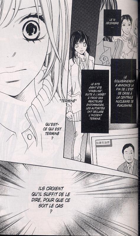 Le quotidien se poursuit à Fukushima. Après tout, on ne peut pas arrêter le temps par contre on peut changer notre rapport à ce dernier. Nos adolescentes vivent leurs derniers moments à l’école avant de choisir ce qu’elles veulent faire adultes. Il faut choisir son université avec le métier à faire plus tard. Mais une rencontre va modifier leur destinée. On va les inviter à jouer dans un camp de réfugiés. Elles ne sont pas pro pourtant ce jour là, elles mettront tout leur coeur et leur peine à faire ce qu’elles aiment. Le problème repose sur leur sentiment de non-légitimisassions à être là en tant qu’amateur. Mais le plus important n’était-ce pas le fait de partager leur amour de la musique? Pourtant, c’est autre chose qui va changer en chacune d’elle. Tous ces gens qui avaient une maison, un jardin, un champ, des animaux… et suite à la catastrophe, ils sont entassés dans des lieux construit à la va-vite. En plus, ils doivent payer un droit pour être là et oublié par l’Etat. Le pire est quand il dit que les problèmes sont résolues, pour eux rien ne change. Pourquoi dire que tout va bien et sur place on voit bien que c’est faux? Nos adolescentes doivent choisir ce qu’elles veulent faire plus tard, c’est le moment. Faut-il quitter ou non Fukushima? Et si elles partaient pour revenir et donner un nouveau souffle? L’une après l’autre, leur chemin se dessine en voulait devenir maîtresse, politique, rizicultrice et psychologue. Ainsi les nouvelles générations seront accompagnés pour mieux accepter leur situation et construire un avenir plus radieux.