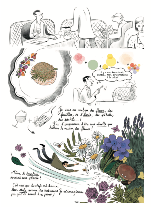 Guillaume sort de l’école de journalisme. Il veut dénoncer des grands complots, faire de l’investigation… Un truc qui peut fait sérieux. Son incertitude fait sourire son grand-père. Pendant qu’il prépare un bon repas, il tente de le sensibiliser à la critique gastronomique. Ce qui fait rire le jeune étudiant car pour lui c’est juste un bon plan pour manger à l’oeil. Le travail c’est juste dire c’était bon ou c’était pas bon. Le papi n’apprécie pas ce sarcasme et lui lance un défi. Pour son stage de fin d’année, il lui propose de s’essayer à la critique gastronomique. Et il va l’envoyer chez les plus grands chefs de notre époque : Arnaud Donckele, Alain Ducasse, Alain Dutournier, Gilles Goujon, Michel Guérard, Laurent Petit, Anne-Sophie Pic et Guy Savoy. A sa plus grande surprise, il va voir la nourriture autrement. Ces chefs ont des convictions, de la passion, de la curiosité… Et lorsqu’il déguste les plats, cela provoque tellement d’émotions en lui que ces aprioris s’envolent. Les saveurs lui rappellent tellement de souvenirs, de moments partagés… Ces chefs, ces hommes et cette femme, qui lui consacrent du temps pour partager l’amour de saveurs, des expérimentations, le respect des produits, les compositions surprenantes… Tout ça va modifier non pas seulement le rapport à la nourriture mais à sa vie.