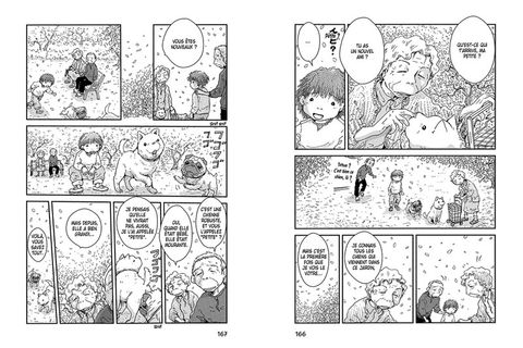 Pas la peine de chercher à savoir l’histoire, la couverture vous émerveille tout de suite avec cette étendue de jaune et ce mignon chien au milieu. Et quand on jette un coup d’oeil rapide, on admire le magnifique dessin plein de beauté et de douceur. Si vous avez l’habitude des Naruto et consorts, vous risquez d’être dérouté par le graphisme plus pur. On assiste à un moment de contemplation, de lenteur, de calme. Vous ne trouverez pas de quête d’identité, de combat… On est plus face à un sujet de société, une famille qui prend un nouveau départ et un homme seul au chômage. Il n’a plus grand chose à perdre maintenant. Avec son chien, il se sent en paix, rassuré et profite de la vie comme elle vient. Une jolie leçon d’humilité. La mort est dans la continuité des choses, sans jugement, sans critique. La fin se termine avec un peu d’espoir avec un fonctionnaire social qui change d’attitude face à cette situation singulière avec les deux cadavres. Lui sait à quel point un chien peut modifier le quotidien et veut rendre hommage aux deux amis. Chaque personnage est touchant et l’on s’attache à chacun d’eux.