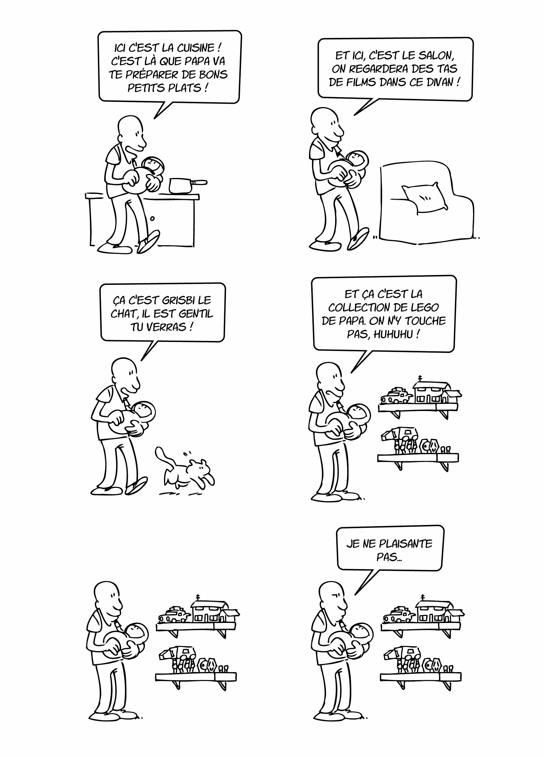 Stéphane Lapuss’ a fait sa place grâce entre autre chose à ses séries « Putain de chat » ou « Les Minions ». Et il est accompagné par son frère Tartuff pour la mise en couleur. Les tranches de vie, le scénariste aime bien les raconter. . Alors on ne s’étonne pas à le trouver partager l’aventure d’être parent et surtout papa. Il faut penser à tellement de logistique et à être délicat, attentif, que cela demande beaucoup d’énergie. En effet, chaque jour il arrive de nouvelles choses auxquelles les parents doivent faire face. Le manque de sommeil et sa nécessité deviennent une évidence quand on en perd. Aucun doute que les papas se reconnaîtront dans les blagues et qu’ils apprécieront le cadeau. En plus, le choix du petit format choisi par les éditions Kennes, permet de le ranger plus facilement dans la bibliothèque.