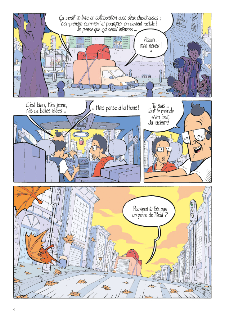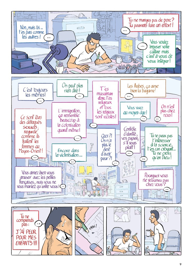 La ligue de l’enseignement, l’organisation des Nations Unies pour l’éducation, la science et la culture et le muséum d’histoire naturelle soutiennent un projet de bande dessinée audacieux pour le jeune public. Comprendre le racisme et l’expliquer paraît quelque chose de complexe. C’est alors qu’intervient Carole Reynaud, historienne et chercheuse et Evelyne Heyer, anthropologue généticienne qui apportent leur regard de scientifique et théoricienne afin d’expliquer les mécanismes de la haine. Et pour compléter le trio, Ismaël Méziane qui peut d’une part partagé son vécu et d’autre part son talent à la fois de dessinateur et à la fois de coloriste. Il arrive à expliquer les choses clairement et synthétique les approches complexes. Ainsi le lecteur peut s’approprier les concepts quelque soit son âge ou soit ses opinions. Par conséquent, il est indispensable à lire, à partager, à être l’outil de discussion, de réflexion… Et aussi à le mettre à disposition dans les médiathèques, les CDI, les bibliothèques des enfants… Lire c’est bien toutefois l’échange, la discussion pour convaincre c’est encore mieux.