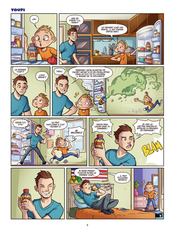 Après le succès de leur bande dessinée « Swan & Néo », les revoilà avec une nouvelle série « Swan & Néo Brothers ». Les deux frères qui cartonnent sur Youtube depuis 2005 avec plus de 5 milliards de vue reviennent pour des aventures plus familiales. Les adeptes qui les suivent en ligne les retrouveront avec plaisir car ils reconnaîtront certaines situations. Le quotidien tumultueux des frangins évoquent aussi bien l’hygiène physique, la diversité alimentaire, les loisirs… Surtout le divertissement avec le test de jeux vidéos. Paolo Campinotti au dessin et Alessandro Russotto à la couleur livrent un travail très dynamique, joyeux et festif. L’énergie des adolescents est fidèlement retransmis au niveau visuel. Ils proposent un travail dans la ligné des autres bandes dessinées de youtubeurs ou de gamers. Au moins, le public adepte de ces univers s’y trouveront rassuré. Pour ceux qui sont plus dans les ouvrages plus traditionnelles comme Lanfeust de Troy ou Largo Winch risquent d’être un peu pris au dépourvu. Surtout Benj, Sophie & Greg offrent des histoires assez courtes qui tiennent majoritairement en une page. Un format idéal pour le jeune public.