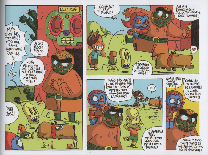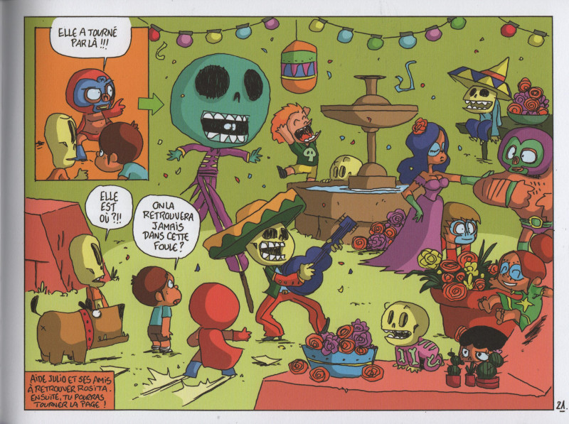 Comment ne pas tomber sous le charme de cette bande dessinée dès la couverture ? Le petit luchadores au slip rouge , au masque avec une tête de mort et avec une cape bicolore est des plus adorables. Surtout avec son regard déterminé et des amis en or, prêt à tout ensemble. On sait tout de suite qu’une aventure loufoque et attendrissante nous attend. Et quand on découvre les premières pages, l’univers graphique reste fidèle à la couverture avec de nombreuses petites cases avec des dessins énergiques et des couleurs dynamiques. L’esprit de la fête mexicaine des morts se montre avec sa dose de bonne humeur, de partage, d’amour et surtout d’amitié. Alors rien d’inquiétant à voir des squelettes qui se baladent ou discuter avec des fantômes. C’est une approche culturelle originale et singulière à proposer pour le jeune public. En plus, tout le monde cultive le vivre ensemble, que l’on soit mort ou vivant, petit ou gros, jeune ou vieux, avec des os ou un costume. Un point plutôt positif qui renforce les points positifs de cette ouvrage. Ces rencontres improbables donnent à l’ensemble une joie de vivre touchante avec une bonne dose d’humour. On apprécie chaque instant passé avec cette bande hors du commun comme tout à chacun aimerait avoir. Une première rencontre qui donne envie de les retrouver pour passer un nouveau bon moment.