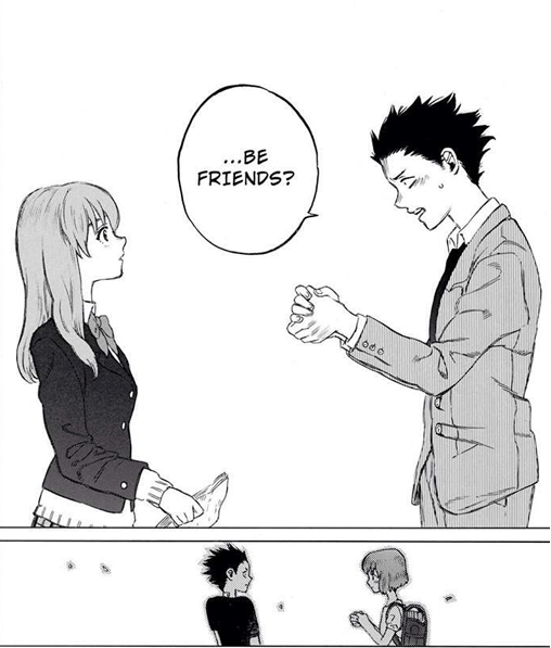 Maintenant qu’il a fait table rase du passé, il va de l’avant pour retrouver Shoko. Il est mort de peur de la rencontrer pour s’excuser de son comportement enfant. En le voyant, la jeune fille fuit et lui en la poursuivant, il tombe. A sa grande surprise, elle va revenir l’aider à se lever. Avec ces mains, il lui présente ses excuses et lui donne son cahier lorsqu’ils étaient ensemble à l’école. Qu’elle n’est pas sa surprise de le voir parler la même langue qu’elle. Il l’a fait pour lui prouver la sincérité de sa démarche. Alors ensemble, il marche jusqu’à un point précis du pont. Elle nourrit les carpes koï avec du pain. Quand la mère de Shoya arrive furieuse, elle ne peut s’empêcher la colère prendre le dessus. Elle prend le cahier de sa fille et le jette dans l’eau, comme pour effacer toutes les traces de cette période. Mais pour la jeune fille c’est plus que cela. Alors elle se plonge pour le récupérer. Shoya va à sa suite pour l’accompagner. Quand ensemble, ils remontent sur le pont, la mère est encore plus énervée et va baffer Shoya. Sa vie doit s’arrêter là. Seulement sa future nouvelle amie lui signe à bientôt. Tout n’est pas perdu. Il va falloir qu’il retrouve un petit boulot, se rachète un vélo, reprenne le boulot… Et sa solitude sera comblée par l’arrivée d’un nouvel ami qui est dans sa classe, Tomohiro. Malgré son enthousiasme, il va l’aider à aller de l’avant même quand ce garçon qui prêtant être le copain de Shoko, va lui nuire autant qu’il peut. Ainsi, l’adolescent solitaire va se construire une toile de personnes fidèles qui lui redonne un peu de confiance en lui et en l’avenir.