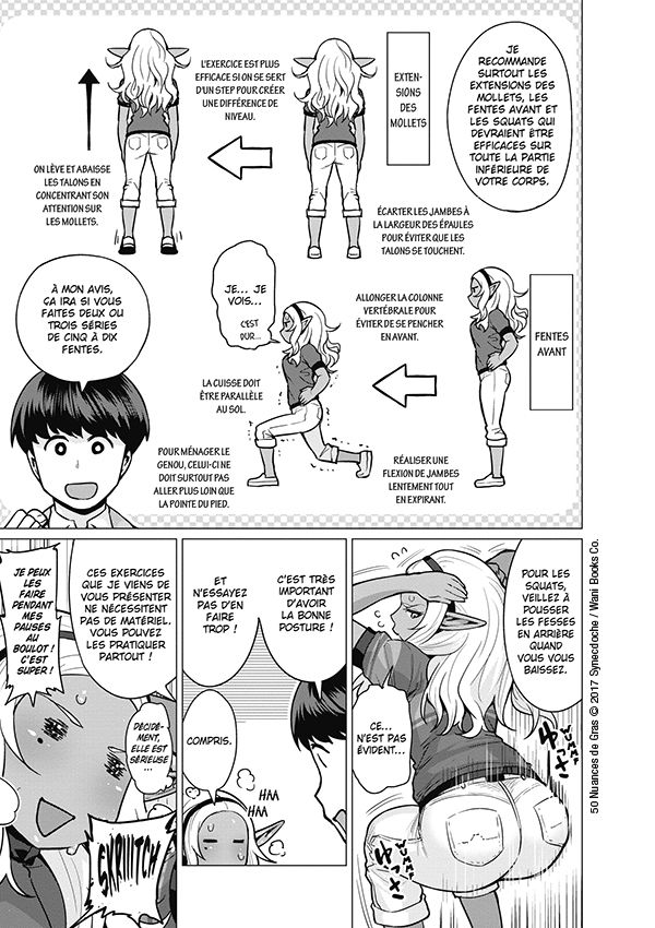 On peut être toujours surpris par l’étendue de l’imaginaire des gens. Cette série « 50 nuances de gras » fait partie de ces lectures totalement improbables. Synecdoche a inventé l’histoire d’êtres surnaturels qui ont des problèmes de surpoids, de douleurs, de rétentions d’eau et qui vont consulter un chiropracteur. Naoe est surpris sans trop de savoir qu’il a des elfes, des démones, des sirènes dans son monde. Il prend son temps, masse certaines et proposent des solutions pratiques aux autres. La chose drôle repose sur des vrais conseils qui sont applicables dans la vraie vie comme des pompes sur le mur. Après le côté comique sur l’elfe qui prend du poids à force de manger des frites ou d’une femme mandragore qui a une mauvaise posture à cause de la fleur qui lui pousse sur la tête, est laissé à l’appréciation de chacun. Etonnamment, les conseils de régime s’adressent généralement aux femmes. Mais ce manga est vraiment à destination de ceux qui aiment les représentations féminines avec des énormes poitrines et grosses fesses. Les corps féminins sont tous sexualisés ce qui interroge sur le public ciblé. A part avoir plus de 15 ans, c’est tout ce que peut nous indiquer la quatrième de couverture. Au final, on en ressort un peu dubitative car qu’en tirer de cette lecture ? L’humour est léger et s’oublie assez vite. Et mater des femmes disproportionnées n’apporte pas grand-chose au final, à part à quelques adolescents en mal d’hormones. Une découverte qui va s’arrêter à ce premier tome.