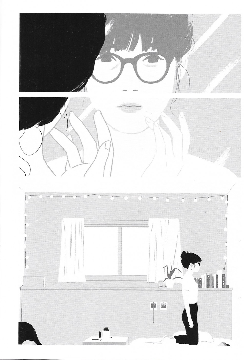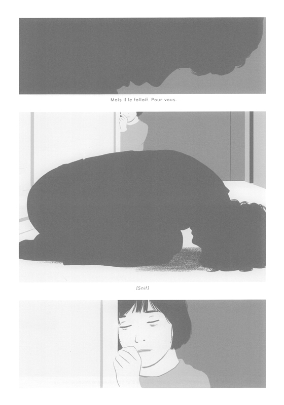 La couverture possède un quelque chose d’attirant. On a envie de savoir ce qui se cache derrière la mélancolie de cette jeune femme. Son visage côté lumière se complète avec celui de son ombre, comme si une dualité complice existait. Il n’en faut pas plus pour avoir envie d’ouvrir la bande dessinée. Et aussitôt on retrouve ce style de dessin numérique très épuré, avec des aplats et un jeu avec le noir, blanc et gris. L’artiste va directement à l’essentiel. Pour son récit aussi, elle ne va pas s’étirer en longueur avec ces différentes étapes dans son ressenti, sa difficulté à trouver sa place, savoir qui elle est. C’est assez épuré ce qui déroute quand on lit des bandes dessinées plus traditionnelles. On comprend le trouble du personnage principal, sa tristesse, son mal-être et sans beaucoup de mot. Pourtant, on peut se sentir un peu troubler par cette approche car le lecteur arrive déjà dans une histoire qui a débuté et se continuera sans lui. On partage un moment de vie, intime, triste et solitaire. Pas le temps de s’attacher, de comprendre, d’accompagner, on est laissé en simple spectateur qui constate. Difficile alors d’être totalement convaincu malgré le nombre de points positifs. Aucun doute que l’on ne sort pas totalement indemne de cette lecture.