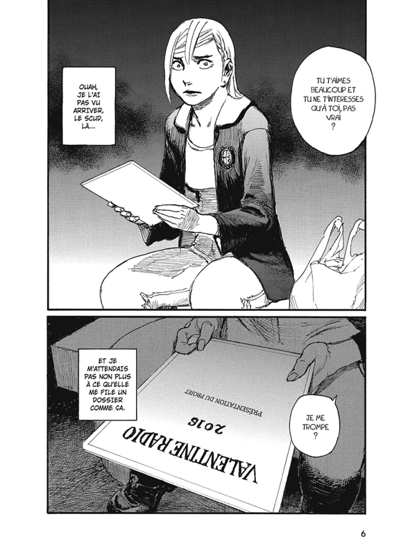 On retourne à la radio pour voir les progrès de Minare. Cette femme au tempérament de feu est face à un doute. Il va falloir qu’elle trouve une identité sonore pour continuer. Hiraoki Samura fait entrer le lecteur progressivement dans le monde très particulier de la radio. A l’ère d’internet, quel place ce média à encore. Le constat n’est pas plus réjouissant en France et les chiffres le prouvent. Peu de personne arrivent à vivre de leur métier d’animateur, même connu. Et sans acheteur de publicité, rien n’existerait. Le secteur est impitoyable. Le personnage principal est prêt à tout et va en profiter pour commencer à se connaître. La fiction doit-elle prendre le dessus sur la réalité? Pour l’instant, on ne sait pas trop. Le mangaka va approfondir cet aspect par la suite. Cette femme colérique va s’intéresser aux autres, les écouter et calmer sa tempête intérieure. Pourquoi n’irait-elle pas vers les autres? On a évolué d’une histoire d’amour à quelque chose de plus introspectif et de perturbant. Toutefois, la trame humoristique reste très présente. En parallèle du boulot à la radio, Minare travaille au restaurant de curry avec ces collègues très importants. Toutes ces personnes différentes permettent de créer de nombreux rebondissements dont certains assez absurdes. Les choses sont bien amenées pour donner envie d’aller plus loin. On sait que la tranquillité reste que de courts termes.