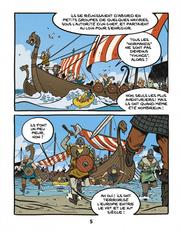 C’est toujours un plaisir de se plonger dans « Le fil de l’Histoire racontée par Ariane & Nino ». A nouveau la frangine emmène son petit frère pour faire un voyage dans le temps et l’espace pour découvrir un peuple très marquant. Les Vikings ont marqué tous les pays grâce à leur ADN de conquérant. Ils ont pu exploiter tous leurs savoir-faire et leurs savoir-être sur tous les continents même les plus froids. Fabrice Erre montre encore une nouvelle fois son talent d’historien et sa passion pour le passé. Les pages se tournent avec beaucoup de plaisir et de connaissances. Surtout qu’en ce moment, ces hommes et femmes remportent un vrai succès avec des séries et des documentaires. Sylvain Savoia conserve son style graphique ce qui est très agréable. Son dessin classique est très lisible qu’importe son âge avec des couleurs assez réalistes. L’ouvrage se clôture sur un dossier pédagogique avec les grands noms de ces aventuriers, leurs navires, les dieux et légendes et un fil chronologique. On referme la petite bande dessinée heureux de ce moment où l’on apprend en s’amusant.