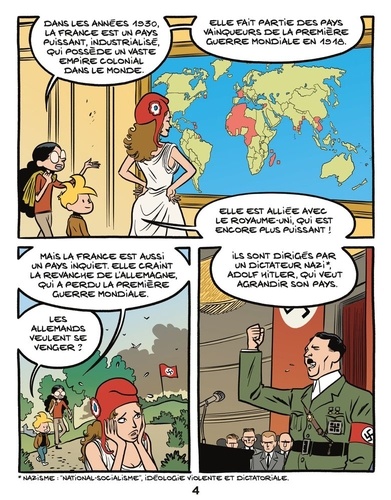 Nino n’a pas très envie d’affronter Léo-Mathis et sa bande au Laser game… Car ces derniers sont sûrs de leur force ! Ariane lui fait remarquer que l’Allemagne nazie, qui se sentait si puissante, a tout de même fini par perdre la Seconde Guerre mondiale… Un conflit qu’Ariane et Nino vont présenter d’une manière inédite, en expliquant comment chaque pays vécut la guerre, avec ses propres particularités. Un album, un pays. Ici la France, qui dut vivre sous le joug nazi, suscitant parmi ses habitants autant de vocations de résistants que de collaborationnistes…