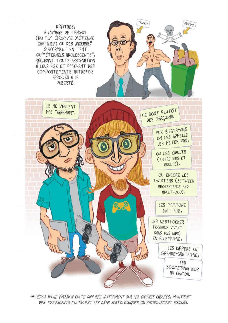 La collection « La petite bibliothèque des savoirs » s’ouvre à tous les sujets. Pour ce 21ème tome, l’anthropologue, David le Breton, propose une approche de vulgarisation sur une période pleine de turbulence avec l’adolescence. Vous ou des gens de votre entourage se sont déjà lamentés du comportement de leur adolescent. Il peut-être trop mou, trop irréaliste, trop incertain, trop dangereux… Il doit apprendre à se construire et à s’affirmer. Dans certains pays, il y a des rites pour marquer la transition mais pas vraiment dans les sociétés occidentales. Beaucoup d’emplois sont précaires qu’importe le niveau d’étude. Impossible de se projeter, de se construire, d’imaginer un futur. En plus, les filles s’affirment par la complicité, la coopération, la négociation et les garçons l’égoïsme, le machisme et la rivalité pour être le meilleur. Malheureusement, adultes certaines comportements masculins développent ces comportements déplacés. Après la lecture, est-ce que les parents pourront trouver des réponses à leurs interrogations? Malheureusement non. Une chose du moins reste sûre, il faut continuer à montrer son amour à ces enfants en transformation jusqu’au jour où cela ira mieux. Si vous voulez allez plus loin, une bibliographie finale est mise à disposition. Pochep apporte beaucoup d’humour et de sérieux à la démarche. La collaboration chercheur et dessinateur permet vraiment de s’approprier des concepts plus simplement. Par contre, j’emmètrerai juste une remarque par rapport à une remarque dans l’avant-propos de David Vandermeulen. Dans le phrase suivante : « C’est ce que relate avec précision le géographe Strabon, contemporain de Jésus-Christ », il cite Jésus-Christ comme si ce personnage a existé vraiment alors qu’il est relatif à une croyance. Son existence est aussi véridique qu’Homère ou Astérix le Gaulois. Dommage de prendre un personnage fictif pour une réalité car cela fait perdre de la brillance au reste du texte. Au final, cela donne tout de même envie de poursuivre de découvrir cette série intelligente et accessible à tous.