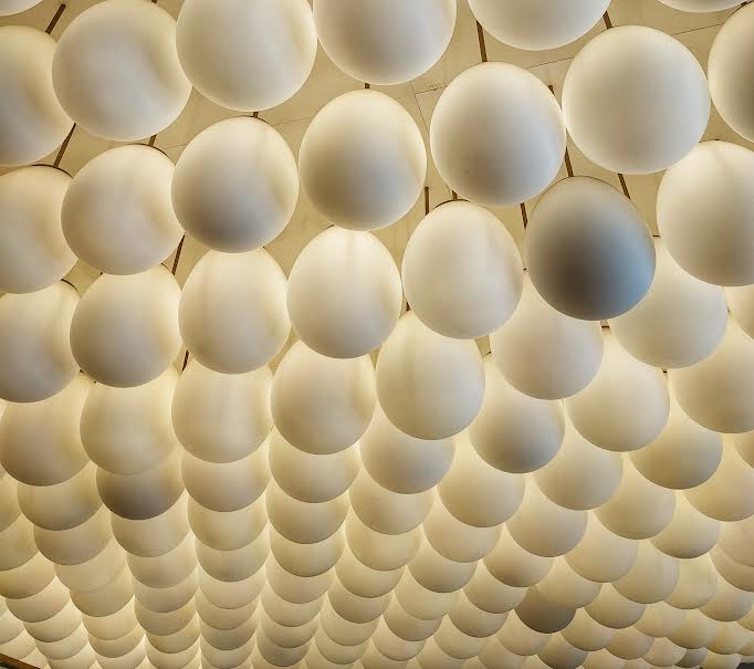 Plafond d’un vendeur de gâteaux avec des lampes blanches pour créer normalement une forme de nuage.