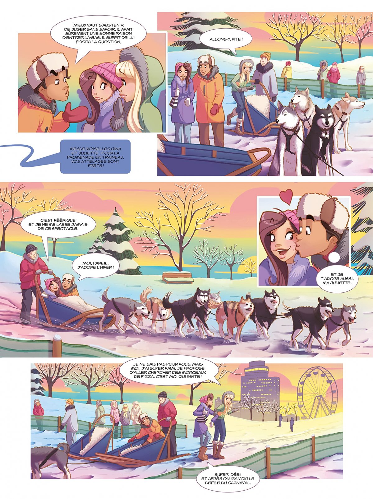 Une histoire qui immerge dans la culture canadienne avec la tire d’érable, le grand froid, le traineau avec des chiens… Aucun doute que cela va permettre le dépaysement pour le lecteur français. En plus, Lisette Morival n’oublie pas des références à la culture populaire comme « La reine des neiges ». Son adaptation du roman éponyme de Rose-Line Brasset va séduire également celles qui ne connaissent que l’autre version. On a envie de se laisser porter par cette gentillesse et cette bonne humeur de ce groupe d’amis. Ils n’hésitent pas à tendre la main vers ceux qui en ont besoin. Bien entendu, la scénariste intègre un personne qui est plus septique que les autres. Une manière de montrer qu’il existe aussi d’autres opinions. Les réflexions racistes font aussi des façons de penser courantes. Le récit se termine bien avec deux fins heureuses permet de clôturer la lecture avec le sourire. L’aspect sociale avec les migrants montrent que l’insertion peut très bien se faire. Les barrières sont celles que l’on se créent et non celles qui existent. Emilie Decrock apporte beaucoup de douceur avec ces traits ronds et ces couleurs chaleureuses. Son travail reste dans l’esprit des précédents tomes. On clôt l’ouvrage avec le sourire et l’envie de retrouver ces héros positifs.