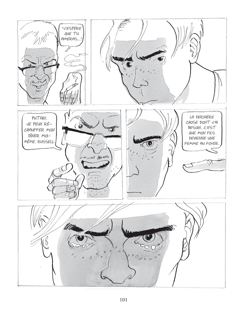 Une fois que l’on ferme l’ouvrage, on se sent assez mal. Très vite, on est plongé dans un récit bien sombre où il n’existe aucune lumière pour s’en sortir. Russel doit vivre avec son père qui déménage dans un autre état. Il sait qu’il n’a pas le père idéal mais il lui propose un toit chez une logeuse qui prépare les repas pour un supplément. Très vite, l’adolescent se retrouve seul et ne sait pas quoi faire. A l’école, c’est bien loin d’être de tout repos aussi. Il se fait humilier par les leaders cruels et l’unique pote qu’il se fait est très étrange. Sa grand-mère s’occupe de lui et il aime bien le contact avec des garçons de son âge. D’ailleurs, pour ça, il est prêt à payer. Pour se protéger, il va s’éloigner car il ne veut pas être la tête de turc pour l’année. Et quand il aurait pu agir pour dénoncer un acte injuste, il n’a rien fait. Cela a jouer un rôle dans le suicide de cet ancien copain. Comment se construire dans de telles circonstances? Comment acquérir des bases solides pour avancer dans la vie sereinement? A cela, le scénariste rajoute la pensée américaine des années 50 pleine de jugements, de racisme et d’homophobie. Un constat affligeant qui montre un pays avec une jeunesse à la dérive qui ne pourra pas s’en sortir. La misère et la solitude deviennent des amis trop fidèle qui n’amènent rien de bien. Alors si vous êtes d’humeur assez triste, passez votre chemin.