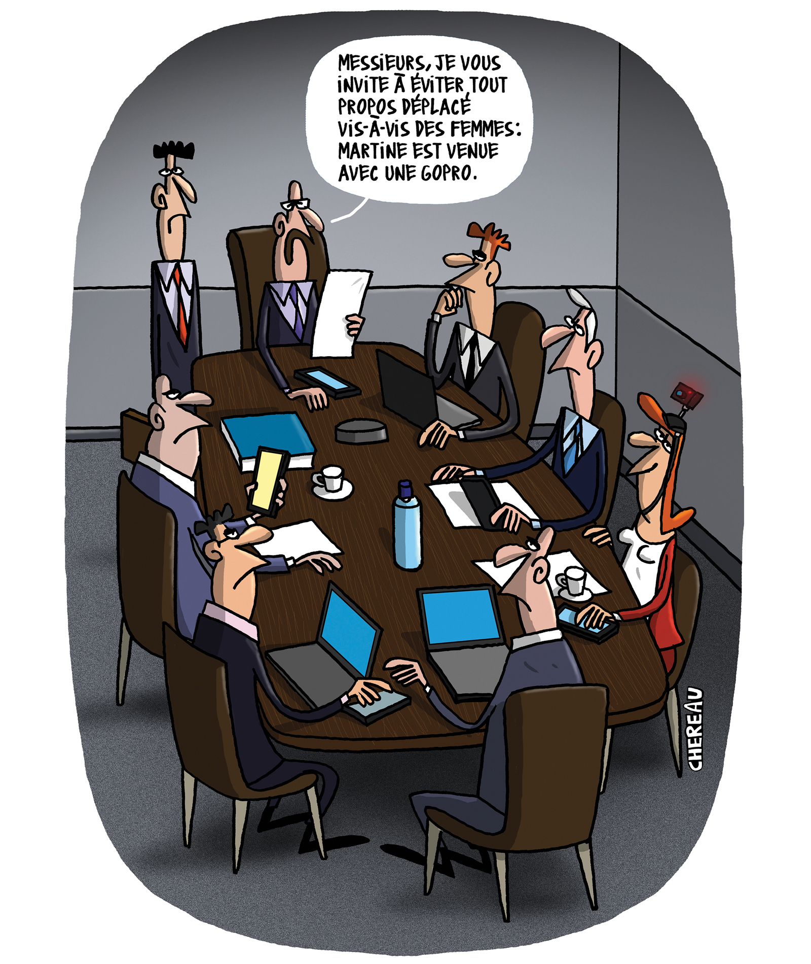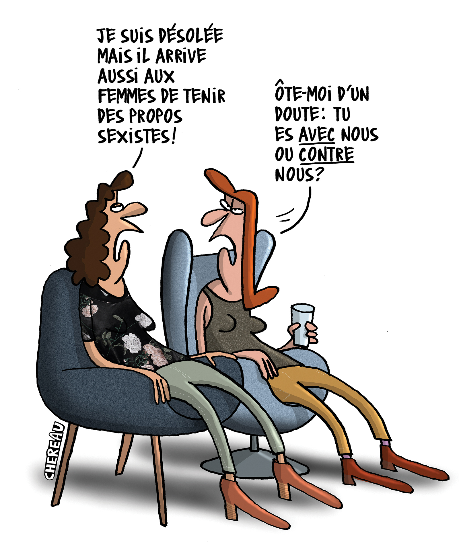 Ce qui était avant un comportement ordinaire a dorénavant un mot : sexisme. Et oui, le royaume de la couille commence à devoir réfléchir à son comportement. Il n’y a rien de normal en embauchant des femmes pour leur physique. Il n’y a rien de normal de mettre des femmes à des postes inférieurs à compétence égales ou supérieures. Il n’y a rien de normal de sexualiser toutes les conversations avec les femmes. Les exemples ne risquent pas de manquer. Ces attitudes perdurent encore de nos jours même si elles sont identifiées. Chéreau arrive très bien en un dessin de montrer l’ironie des situations. Espérons que certains lecteurs se sentent concerner pour changer d’attitude. Au pire, cela fera rire jaune celles qui connaissent que trop bien ce genre d’individus. Comme quoi aucun sujet n’est interdit dans l’humour.