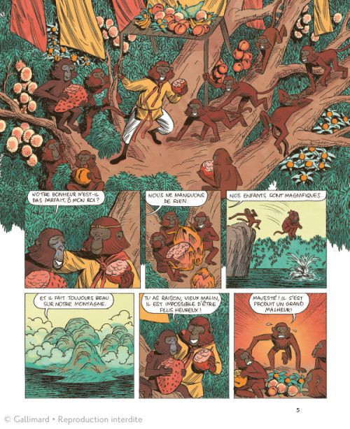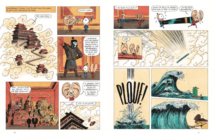 Ce qui surprend est l’obsession des scénaristes pour l’histoire autour du roi Singe. On trouve plusieurs adaptations où l’imagination se mêle à merveille pour s’approprier un récit mythique. Petit rappel des origines : Sun Wukong, combattant roi singe de « Pérégrinations vers l’ouest » écrit par Wu Cheng En au 17ème siècle. En français, il a été traduit sous d’autres titres : « Le Voyage en Occident », « Le Singe pèlerin » ou « Le Roi-Singe ». D’ailleurs, c’est en rapport avec ce titre qu’a été choisi pour la série pour raconter l’histoire de ce roi en quête d’immortalité. Une autre version par rapport à « Dragon Ball » d’Akira Toriyama qui s’inspire du même mythe. Le côté spirituel est pour l’instant mis de côté. Car dans le roman-fleuve, on suit le voyage du bonze Xuanzang, fondateur du bouddhisme chinois. Il a pour compagnon un singe irrévérencieux, Sun Wukong et un cochon anthropomorphe, Zhu Bajie. Ensemble, ils vont de Chine en Inde, source supposée du bouddhisme. Le récit est un peu autre ici puisque le roi singe est le personnage principal et qu’il va rencontrer des êtres très singuliers comme un oeil, une oreille sur des jambes. On suit sa progression de petit singe né d’un oeuf en or à un être de plus en plus puissant. Très vite, il se fait des amis et s’enquière des autres. Une interprétation très libre de l’ouvrage. Les divinités commencent à réfléchir pour se liguer contre lui. Vincent Sorel choisit une trame assez classique pour ne pas dérouter le lecteur. Le graphisme est en adéquation avec des traits vifs, des représentations absurdes… Il se permet de grandes libertés loin des standards chinois et/ou de l’imagerie religieuse. On se laisse porter dans l’action sans jamais s’ennuyer. En soi, notre héros est sympathique, gentil, avenant contrairement à la source d’inspiration. Le roi singe est plus égocentrique, narcissique, prétentieux, irrespectueux… On veut savoir ce qui va se passer, comment vont tourner les choses, s’il est immortel. Une premier tome assez gentil mais reste en suspens une question. Comment va se faire alors le récit d’apprentissage? L’avenir nous le dire.