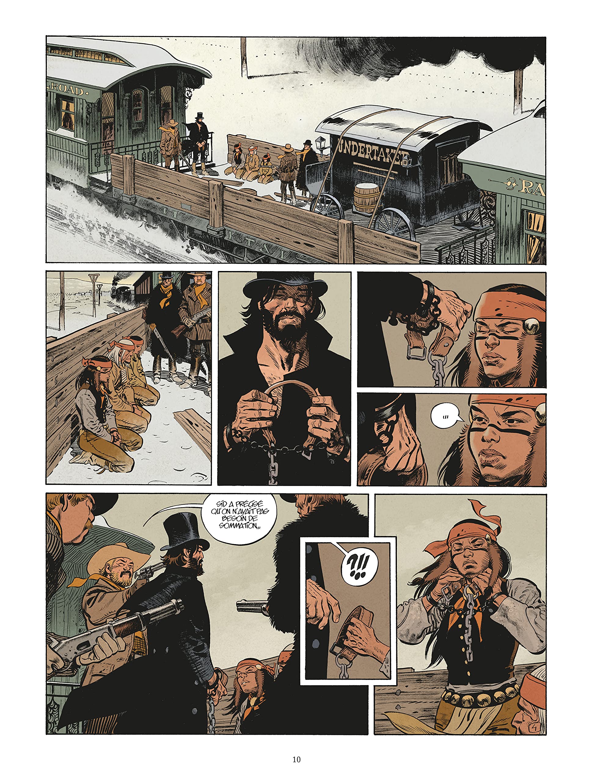 Ralph Meyer et Xavier Dorison m’ont réconcilié avec le western grâce à leur excellente série « Undertaker ». On est tellement loin à la fois des « Tuniques bleues » et de « Blueberry ». Des histoires d’hommes qui gèrent des problèmes d’hommes. Le duo a décidé de monter d’un niveau l’exigence scénaristique et graphique. On garde en grande partie les code du genre par contre en terme de scénario, on va chercher plus loin, plus précis, plus exigeant, plus humain. Dès les premières pages, nous sommes transportés au coeur de complot. Ce dytique ce termine sur une note positive et pleine d’espoir pour notre croque mort préféré. Il en a vue des morts injustes, des guerres de territoires où l’on tue sans pitié des indiens, la loi du fric prime sur le respect humain… En aucun cas, il se montre comme celui qui détient la vérité mais comme celui qui a des principes. C’est l’horreur qui lui a fait prendre un autre chemin et accepter la résilience. L’injustice, il ne supporte pas ça et quand il est embrigadé malgré lui dans des combines, il fait au mieux. Ce tome se dévore d’une traite sans jamais s’ennuyer une seule case. Que cela soit texte, image et couleur, notre trio propose toujours une histoire aussi forte, ingénieuse, piquante, drôle et dramatique. Ils exploitent à merveille les travers des humains en utilisant la psychologie humaine et sa représentation. Un ouvrage à avoir impérativement dans sa bibliothèque et à offrir aux amoureux des cow-boys, indiens et armée.