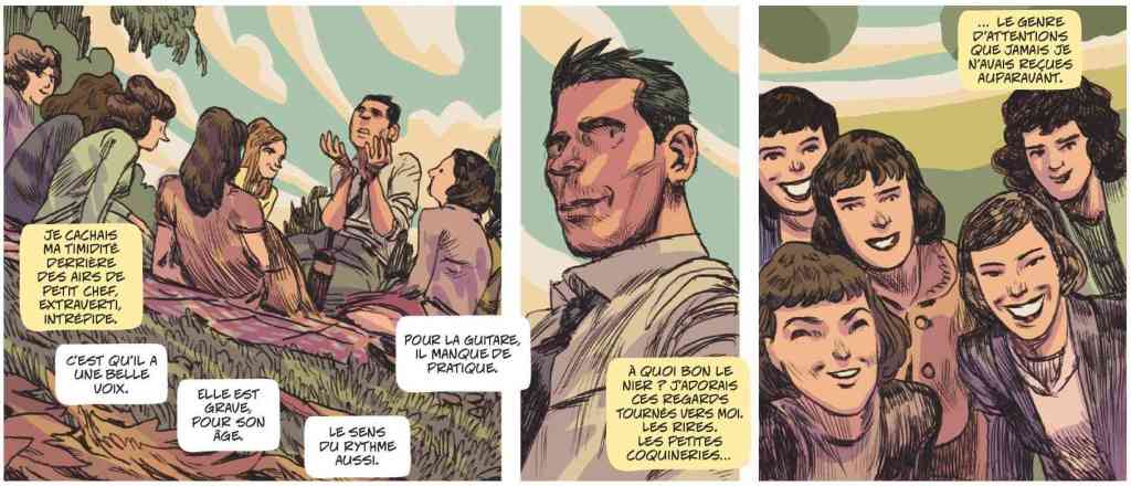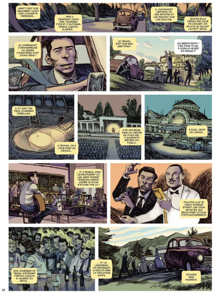 Si l’on vous donne les titres des chansons suivantes : « Ne me quitte pas », « Amsterdam », « Quand on n’a que l’amour », « La Valse à mille temps », « Ces gens-là« , cela évoque tout de suite un chanteur. Que sait-on vraiment de l’individu qui se cachait derrière l’artiste? Jacques Brel reste un être secret dont on connaît quelques anecdotes et qu’il est enterré aux îles Marquises. Salva Rubio écoute sa fibre d’historien pour en savoir plus. Il va mener une enquête qu’il expliquera très bien en postface de l’ouvrage. On sent vibrer sa passion d’aller trouver des réponses, d’avoir des vraies informations. Pour raconter ces découvertes, ce n’est pas moins de trois tomes qu’il faudrait. Ce premier introduit l’adolescent belge en quête d’avenir à l’artiste de renommée qu’il commence à avoir. Les 64 pages se tournent captivé par cette personnalité entière qui se découvre, qui découvre l’amour ainsi que l’essence de sa vie. L’amour qu’il ne connaissait pas vraiment, il en voit un nouveau visage. Difficile d’en parler tant que l’on a pas eu le coeur brisé. C’est grâce à cela qu’il écrira des chansons qui parleront à toutes et tous. Un artiste insatiable qui a toujours besoin d’aventures. L’ennui est son pire ennemi. Le scénariste arrive très bien à donner cette tension et cette passion très vivace. Sa nouvelle collaboration avec Sagar, montre une confiance et une complicité entre les deux créatifs. Malgré une grande densité d’informations, aucune lourdeur ne se fait sentir, bien au contraire. Le graphisme avec les traits noirs marqués nous plonge à merveille aussi bien dans le Paris des années 50, en Belgique ou au Maghreb. Un duo qui montre avec élégance et d’intelligence l’intimité d’un homme simple, exigeant et torturé. On n’a très envie de poursuivre avec le second tome.