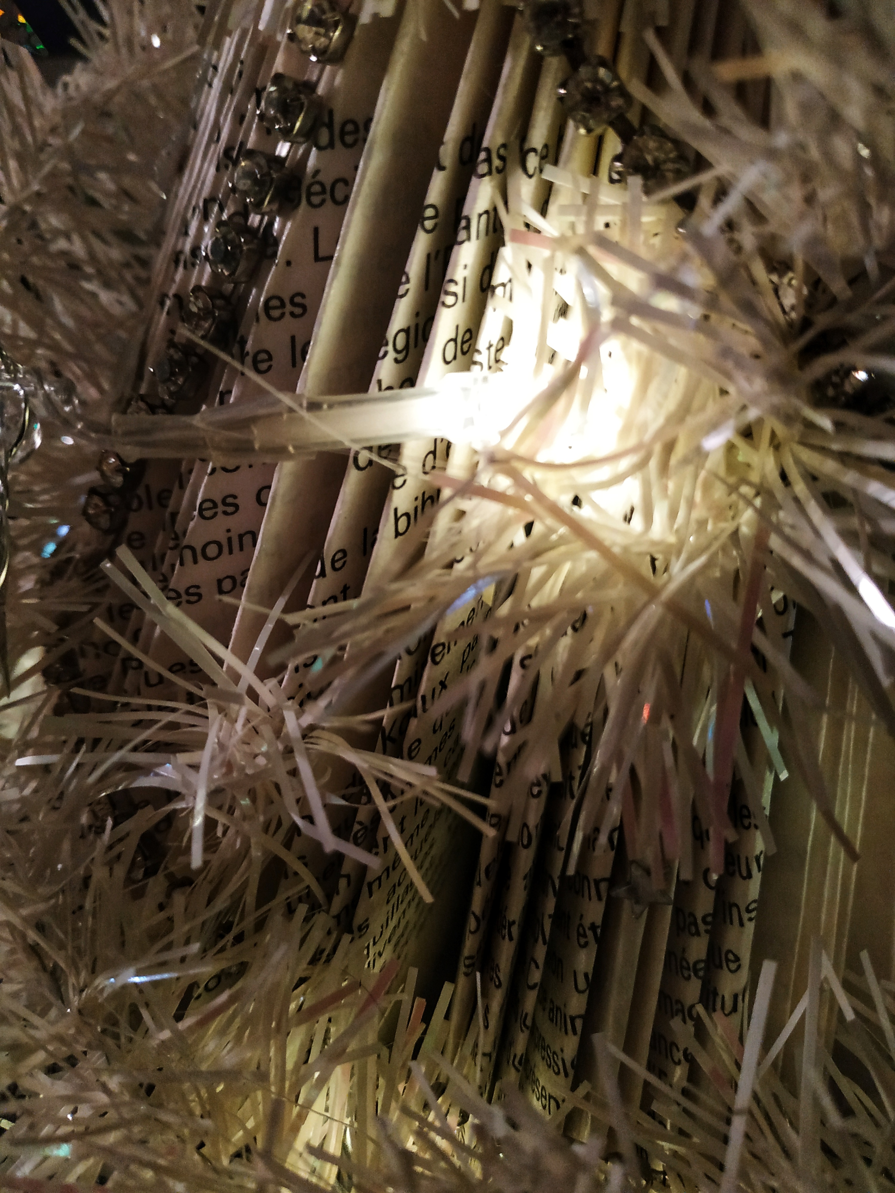 J’aurai pu choisir les grosses décorations que l’on retrouve dans de nombreuses villes. J’ai choisi un gros plan d’un petit sapin en papier, recyclage de livres, décoré avec une guirlande lumineuse qui scintille et une guirlande standard. Quoi de mieux pour une amoureuse des livres?