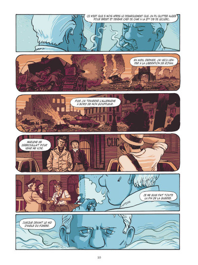 L’histoire débute au milieu de la seconde guerre mondiale. Par conséquent, l’utilisation du flash-back devient impératif pour raconter la vie d’une personne. Les évènements à raconter dans la vie de Jean Gabin ne manquent pas, aussi bien au niveau de sa famille, de son travail que du point de vue amoureux. L’enfance n’a pas été si heureuse entre le déracinement à la terre, la mort de sa mère, l’obligation de faire des études supérieures… Sa voix, il va la trouver tout en gardant en tête de revenir un jour à la terre. Les affres du cinéma ne lui font pas oublier d’où il vient. Pour les femmes, c’est une autre histoire, car il a les officiels, celles qu’il épouse et celle avec qui il couche. La fidélité reste un concept hors du temps et de la réalité. D’ailleurs, en parlant de temps, Vincenzo Bizzarri joue assez bien avec ce dernier en jouant avec les teintes. Impossible de se perdre sur le moment. Du marron avec des cases aux bords arrondis pour le passé, des cases en bleu pour l’acteur jeune et les teintes plus classiques pour l’homme sur la fin de carrière. Le dessinateur coloriste joue avec les nuances de bleu ce qui est très ingénieux. Un choix pertinent de teinte au vu du titre « L’Homme aux yeux bleus ». Un atout qui a toujours servi au comédien. La dualité des teintes vient également quand l’homme passe aux souvenirs. Les trois entités entrent en discussion et en accord. Le dessinateur propose une approche très réaliste des personnalités que l’on peut pour la plupart identifier. Ceux qui ont connu cette époque pourront jouer à trouver les noms. Toutefois cela n’est nullement un ouvrage réservé à un public sénior qui a baigné dans les films français en noir et blanc. L’ouvrage rend hommage à un artiste qui a marqué les mémoires. Chaque année, la télévision rediffuse aussi ces films qui sont le symbole du cinéma français d’une autre époque. Noël Simsolo va s’intéresser aussi bien à l’homme qu’à l’artiste. On découvre qu’il était très proactif dans les films à faire ainsi que dans le choix des actrices. Le hasard n’était pas vraiment ce qu’il recherchait. L’important repose toujours sur le travail effectué avec sérieux et investissement. Le duo à la plume et à l’image a réalisé un ouvrage qui devrait séduire autant les fans que les néophytes. En plus, à la fin on retrouve l’ensemble des productions que cela soit en disque, au théâtre et bien entendu sur 47 année en lien avec le 7ème art. Vous risquez d’avoir envie de voir ou revoir des éléments de sa filmographie.