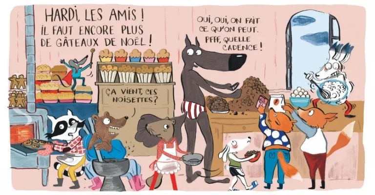 Il n’est jamais facile de parler de sujets sérieux à des enfants. Comment leur faire comprendre l’important d’une chose sans pour autant les inquiéter? Wilfrid Lupano a tellement d’expérience dans la réalisation de scénario qu’il est arrivé à trouver la manière de faire. Il fallait un expert pour être capable d’un tel exploit en rajoutant en plus une touche d’humour. Comment ne pas tomber sous le charme du loup en slip? Et ce qu’importe son âge. Il a choisi cet animal mythique, souvent présenté tel un terrible danger qui irait jusqu’à voler des bébés pour les dévorer. Déjà, il a fallu déconstruire et créer le lien avec les enfants. Cela n’a pas été si difficile puisque les petits et le loup possède des points commun : la mauvaise foi, le mensonge, l’égocentrisme, le narcissisme… La vie prouve que parfois, il faut laisser cela au placard et s’ouvrir aux autres car les amis et la famille c’est super. Notre héros a pris sur lui et a changé pour être plus heureux. D’ailleurs, ce n’est pas pour rien qu’il a un slip maintenant. Et que même le hibou fasse un magnifique cadeau. A la nuit tombée, le casse-noisette prend vie et l’emmène vivre une incroyable aventure. J’ai beaucoup aimé les représentations quand nous avons beaucoup d’idées dans la tête où l’on voit apparaître les choses dans le cerveau. Et aussi la représentation des chocotes à travers des petites boules noires qui dansent pour accentuer la peur. Un sentiment que chacun a, surtout les enfants qui clament de leur fierté : « Non j’ai pas peur! ». Poussé par son nouvel ami, il va agir et découvrir quelque chose de terrible. La forêt interdite cache l’exploitation d’animaux pour ramasser des noisettes, la modification de la nature qui fait penser aux OGM et la robotisation avec un robot policier. Tous les grands sujets sont posés ce qui peut amener à avoir des discussions avec les plus petits. Est-ce que cela te semble normal que l’on fasse travailler des enfants? Est-ce que tu penses que cela existe vraiment? Vous pouvez ouvrir une porte à la conscience du monde. Une façon au combien ingénieuse et pertinente de parler de la réalité et de montrer que chacun d’entre nous peut avoir un rôle à jouer pour que les choses changent. L’univers graphique de Mayana Itoïz apporte beaucoup de fantaisie, des décalage, de folie qui amusent petits et grands. On sourit et on réfléchit en tournant les pages. Une nouvelle fois le loup en slip a sévi pour montrer l’étendue du champ des possibles. Et pour les adultes, il y a la petite histoire sur les deux dernières pages de l’album en rapport « Aux vieux fourneaux ». Un clin d’oeil qui donne envie de retrouver ces vieux briscards, eux aussi qui n’ont pas leur langue dans la poche.