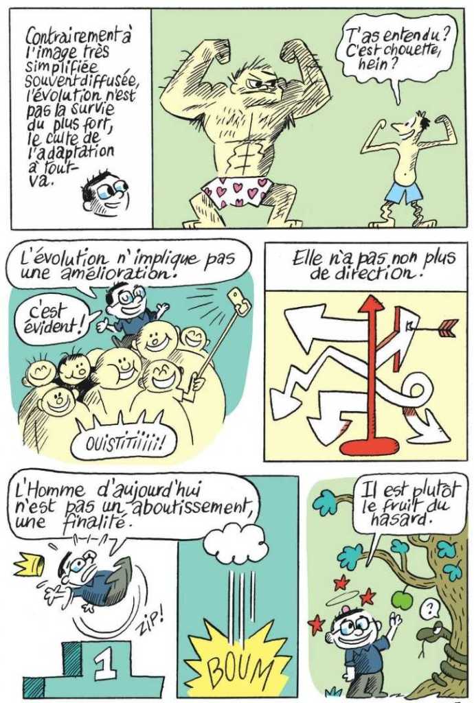Rendre compréhensible le terme homo sapiens n’est pas très facile. C’est une chance qu’à la plume nous trouvons : Antoine Balzeau, chercheur au CNRS et qui travaille dans « l’unité naturelle de l’homme préhistorique » au musée d’Histoire naturelle. En plus, il a déjà quelques livres de vulgarisation à son actif. Pour permettre au lecteur d’être détendu, l’approche est assez décontractée avec beaucoup d’humour. Ce qui peut surprendre est un parti pris que l’on peut lire rarement ailleurs. « Ne croyez pas tout ce que disent les chercheurs. Certains ont plus d’imagination que d’autres. Il s’agit de faire le tri entre vraies données scientifiques et la part d’interprétation que livre un chercheur. Exemple thématique totalement affabulée : la représentation des activités des femmes et des hommes de la préhistoire. Profitons-en donc pour détruire un cliché profondément ancré. Cela permettra à certains d’adopter une autre vision. » Et il continue plus loin : « Alors, croyez-vous franchement qu’il y ait la moindre raison biologique ou logique à ce qu’une femme préhistorique n’ait pu prendre part à une chasse au grand herbivore. Aujourd’hui, chacun peut bien sûr faire ce qu’il souhaite, mais vous ne pourrez plus utiliser l’héritage supposé du paléolithique pour justifier vos propres idées machistes! Le coup de grâce à cette idée reçue a été donné suite à plusieurs études scientifiques récentes… Elles ont montré que chez les peuples « chasseurs/cueilleurs » qui vivent encore aujourd’hui, les activités sont réparties équitablement entre hommes et femmes ». La période préhistorique a été écrite par des hommes qui voulaient justifier le patriarcat avec un argument que c’est naturel car cela a toujours été ainsi. Maintenant le discours commence à changer car les choses reposaient sur un apriori pris comme fait alors que rien ne l’étayait. Cela fait plaisir qu’un expert puisse avoir un discours si franc et sans concession. Il faut espérer qu’il puisse être entendu et faire évoluer les mentalités ainsi que les représentations. La misogynie n’est pas le seul point à discuter. Il y a bien entendu le racisme qui n’est pas non plus un fait naturel mais bien aussi une construction sociale. Qu’est-ce que l’on n’est pas prêt à inventer pour justifier la supériorité de l’homme blanc pour asservir les autres? « Nous avons tous, oui TOUS, des fragments de notre génome qui nous viennent des 4 points de la planète! Même le plus obtus des racistes, persuadé que tous ses aïeuls viennent de son quartier, a des ancêtres appartenant aux populations qu’il hait, sans même savoir pourquoi! Nous avons des nationalités, des langues, des religions et cultures diffé On sait que cela prend du temps comme l’explique avec brio, le directeur de collection de « La petite bédéthèque des savoirs », David Vandermeulen. La puissance religieuse est telle qu’il est difficile de remettre en cause ce qui est écrit dans la Bible. Aucun peuple ne peut exister s’il n’est pas dans la référence indiscutable. Et ceux qui osent dire le contraire ont bien souvent fini assez mal. Il faut attendre que la laïcité prenne plus de place pour que la parole scientifique puisse trouver sa place avec des preuves à l’appui. Le temps ainsi que la volonté de certains individus changent la donne. Pour preuve, on est au 21ème siècle et les connaissances sur la préhistoires sont encore pleines de richesse grâce à la confrontation de points de vue et l’évolution technologique. Pierre Bailly apporte beaucoup d’esprit et de fantaisie. Une bande dessinée intelligente, réflexive et ingénieuse à lire, à partager et à offrir bien entendu.