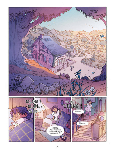L’herboristerie n’est pas un sujet très présent dans le 9ème art. Flora Grimaldi a décidé de s’en emparé et de l’intégré dans une histoire pour les enfants. Mauve Bergamote est une petite fille singulière avec des cheveux mauve, vivant dans une grande maison avec un être ayant une tête de citrouille, Crookneck. Elle suit l’école de la vie en récoltant des plantes, en semant des graines et en réalisant des préparations pour la boutique. Ses parents sont partis pour une durée illimitée. Des adolescentes en sortie scolaire se perdent et viennent piétiner un jardin pour faire de jolies selfies. Anaïs vient s’excuser et offre un dessin. La résidente ne semble pas heureuse de cette démarche. La personne qui veille sur elle, l’incite à se comporter autrement et invite même Anaïs à faire son stage. L’enfant croyant que l’on veut la remplacer se montrer désagréable jusqu’au moment où elle découvre que l’extérieure peut être aussi une richesse pour elle. Une façon élégante de parler de la nature comme lien social. On découvre la richesse des végétaux partout présents et qui peuvent soigner beaucoup de choses réelles et irréelles. D’ailleurs, à la fin on trouve des recettes de produits comestibles. Cécile propose un univers graphique assez réaliste avec un soupçon de fantaisie pour y faire émerger le merveilleux. Un ouvrage assez chaleureux et sympathique qui devrait ravie la jeunesse.