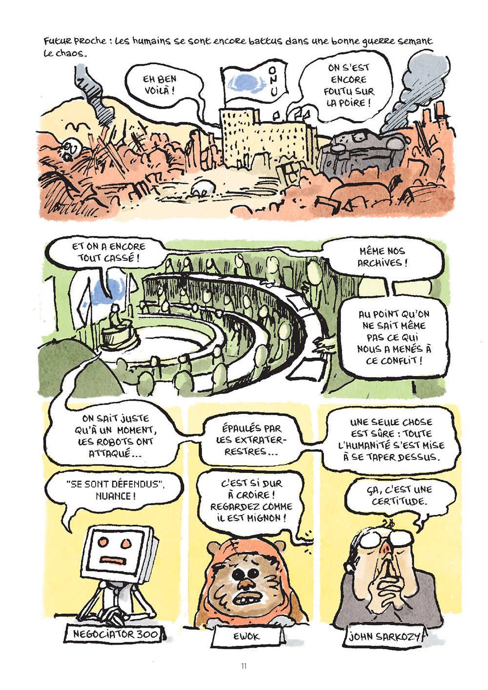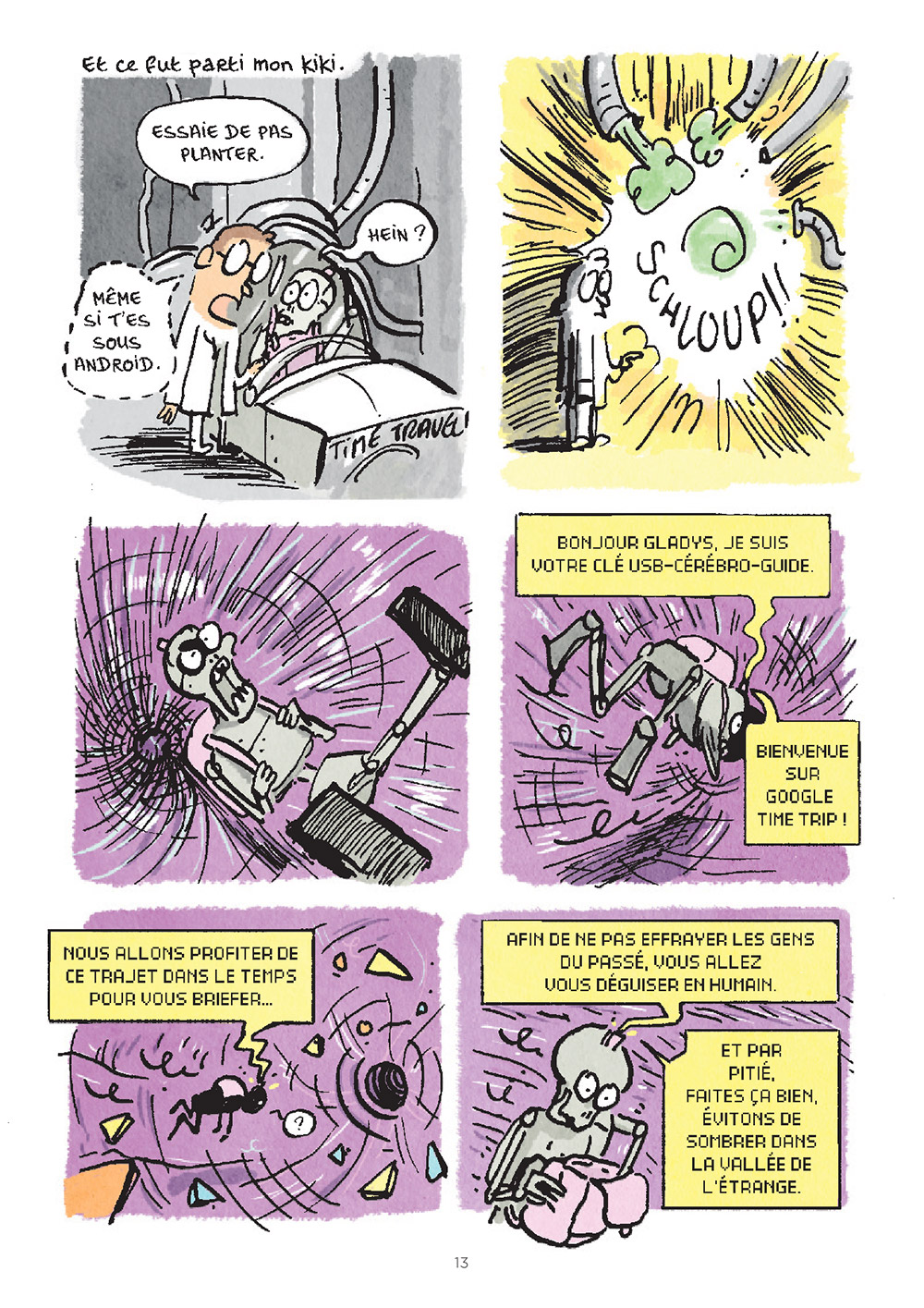 Pour commencer la collection « La petite bédéthèque des savoirs », David Vandermeulen a choisi un sujet dans l’air du temps : l’intelligence artificiel. Même si l’ouvrage est paru en 2016, il reste d’autant plus intéressant en 2022 où les technologies ont avancé. Les questions face à ces innovations ne changent pas du temps. Est-ce qu’elle va prendre la place de l’humain? Est-ce que les robots vont dominer le monde? Des sujets très inspirants pour les auteurs de science-fiction. D’ailleurs, on ne peut pas aborder l’IA sans eux car avant même d’être théorisé, développé, elle avait pris naissance dans l’imagination de plus d’un homme. D’ailleurs, on aura le droit à toute son Histoire car Jean-Noël Lafargue, enseignant et expert en nouvelles technologies propose une aventure où l’on part du futur. Pour comprendre les origines d’une guerre des robots, on envoie un robot, Gladys, doté d’une intelligence artificielle et disposant d’une puce mémorielle dans le passé. Qu’est-ce qui a fait que l’on en arrive à ce point? Une façon drôle de permettre de refaire l’historique complet. David Vandermeulen fait déjà un avant-propos très complèt pour mettre dans le bain le lecteur. Il évoque la réplique mécanique de Francine Descartes, la nouvelle « L’Homme le plus doué du monde » (1879) d’Edward Page Mitchell, le robot autostoppeur HitchBOT (2014/2015), l’IA Watson au Jeopardy en 2011, le transhumanisme avec Raymond Kurzweil… La crédibilité du récit vient de l’adoubement de la référence, Daniel Goossens, auteur de bandes dessinées et d’essais sur le 9ème art et surtout chercheur en Intelligence Artificielle à Paris VIII. La peur irraisonné a toujours été là. Pour l’instant un enfant de 3 ans à plus de compétence qu’il développe seul qu’une IA la plus perfectionné. Puis on passe à l’action sous le dessin et les couleurs de l’ingénieuse et drôle Marion Montaigne, la créatrice du Professeur Moustache. Il fallait bien une vulgarisatrice de haut niveau pour inaugurer cette série de mise en bouche des sciences. Rire intelligemment et apprendre est le créneau de cette artiste assez singulière qui adore intégrer des clins d’oeil à la culture populaire comme Stars Wars, Stephen Hawkings, Terminator… Le duo se complète assez bien et nous propose une lecture passionnante qui se dévore. Attention vous risquez de prendre pleins de note pour bien vous souvenir de toutes ces données. Nous ne sommes pas encore des robots avec des aptitudes d’enregistrement presque illimité sur notre disque dur interne.