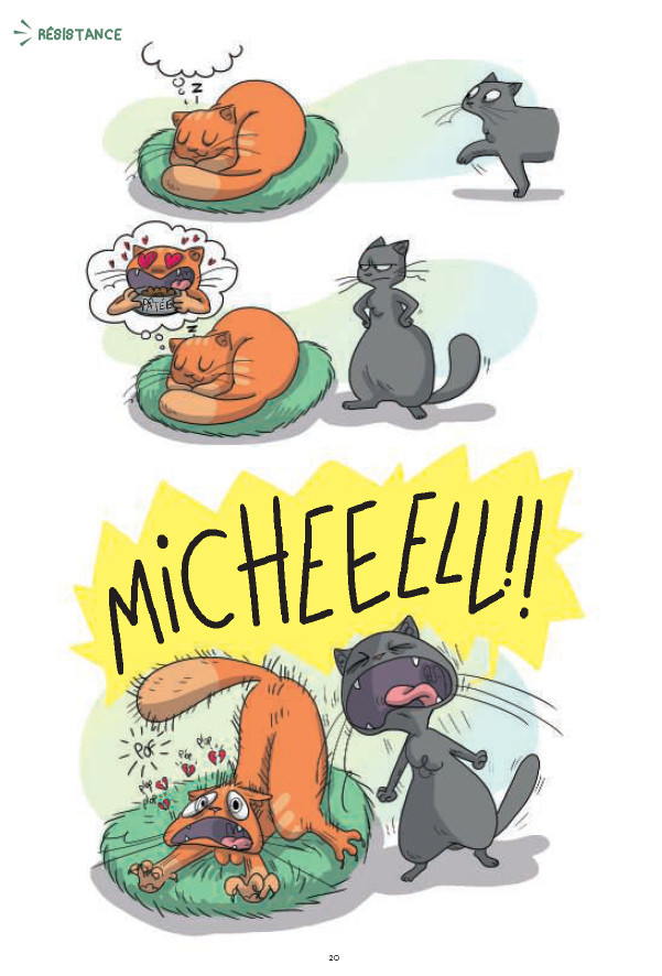 A la première vue, on pourrait se dire que c’est malin comme stratégie éditoriale. Les bandes dessinées autour des chats sont très populaires et l’intérêt au sujet de l’écologie s’accroit. Pourquoi ne pas mélanger les deux avec des gags, des références au développement durable et bien entendu de le mettre en avant avec la couleur de référence : le vert. Même s’il doit y avoir une partie de vraie, il y a un peu plus que de la communication. Bénédicte Moret s’est fait un nom depuis 2014 avec sa famille Zéro Déchet et son dernier album « Ze journal de la Famille (presque) zéro déchet ». Les chats font parties aussi de la famille. Alors pourquoi ne pas leur consacrer un album en gardant cette réflexion d’une démarche globale dans le changement? Bien entendu, la scénariste choisit l’angle humoristique puisque s’oppose Pascal, le chef, sur de lui et Michel, plus dilettante, calme et qui adore manger. Difficile d’insuffler en lui de la rébellion car pour lui bio ou pas, cela reste très comestible. Et c’est tout ce qui compte. Forcément, son implication sera réduite dans la fronde ce qui permet de nombreuses situations cocasses et charmantes. Il servira par exemple de matelas à des rouges-gorges. Ceux qui ont des félins à leur côté se retrouveront certaines aventures. Tous les lecteurs passeront un moment sympathique de lecture.