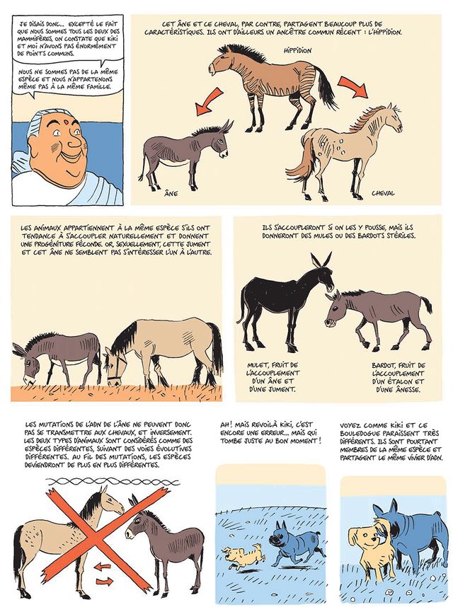 On le sait bien que pour permettre aux informations d’être enregistrées sur notre disque dure interne, rien de tel que de l’humour et de se mettre au niveau du lecteur néophyte. Ainsi on suit Yuval Noah Harari qui va rencontrer des spécialistes par domaine pour discuter de l’évolution des espèces en compagnie en générale de sa nièce, Zoé. Candide versus sachant qui prend le temps d’expliquer, d’argumenter, de montrer et de façon accessible. Pas d’entre soi scientifique. « Mais l’absence de preuve n’est pas la preuve de l’absence ». Ici on vise les références à la pop culture comme ces incursions d’un faux comics d’une autre époque qui raconte la vie de sapiens. Ainsi aussi bien les adolescents que les adultes peuvent s’adonner à ce plaisir de la lecture intelligente et pas prétentieuse. Peut-être que vous ne dévorer pas les 300 pages d’un seul coup mais ce n’est pas très important. Vous pourrez aussi prêter ou offrir ce livre pour en discuter avec votre entourage car après tout la collaboration est à l’origine de l’évolution et non l’individualisme comme on serait tenté à le croire. « En science, admettre l’ignorance est bien mieux que d’inventer des fictions ». Les angles aussi bien culturels, sociétaux, historiques, anthropologiques sont abordés car nous sommes dans une culture du récit.