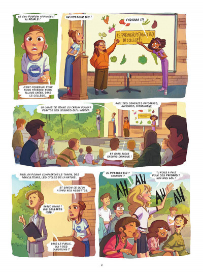 Même si on peut se dire que c’est une bande dessinée dans l’air du temps cela ne veut pas dire qu’elle manque d’intérêt. Loïc Nicoloff est arrivé à construire une histoire avec beaucoup d’ingéniosité. Il arrive à trouver le bon équilibre entre les mésaventures d’adolescentes, la vie à l’école et à la maison et la prise de conscience environnementale. Progressivement, le club de copines, Fadila, Lily et Emma vont proposer un projet concret dans leur collège. Il n’attire pas foule ce qui est bien normal. La superficialité prend souvent le dessus sur des choses plus nécessaires. Alors elles vont voir plus grand et sur le chemin de leur objectif elles vont aborder la pollution des mers, du sol, numérique, le réchauffement climatique, la surconsommation… Alberto Zanon va l’aborder dans les échanges entre amis mais aussi avec des articles qui prennent une page entière. Son dessin est assez standard pour le coeur de cible avec des choses très précises, léchées, parfait, sans défaut. Il choisit de faire trois filles aux physiques et à la structure familiale différentes. Ainsi la lectrice pourra plus facilement s’identifier à un groupe. En plus, on rajoute un garçon qui veut aussi agir. Une amourette se profile pour la suite. On peut trouver cela dommage la trame assez moralisatrice, assez binaire, le faux rebondissement sur l’identité de l’héroïne cependant cela reste adaptée à qui cela s’adresse. Il faut le regarder avec un oeil d’un enfant entre 12 et 16 ans. Dans le petit détail, c’est dommage que l’école se Philippe Monot et non Théodore Monot, scientifique naturaliste biologiste et explorateur. A la fin, on ressort ravie de la lecture. On voit que l’activisme n’est pas une question d’âge. Même si au collège on ne maîtrise pas toute la compréhension d’un sujet cela n’empêche pas de d’essayer de comprendre, de réfléchir et pousser à faire. Tout le monde peut faire la différence et être la graine du changement qui deviendra éventuellement un arbre. Un ouvrage à offrir aux adolescentes qui s’interrogent sur l’environnement et leur rôle. Aucun doute que leur curiosité sera titillée et auront envie d’engager une discussion intéressante.