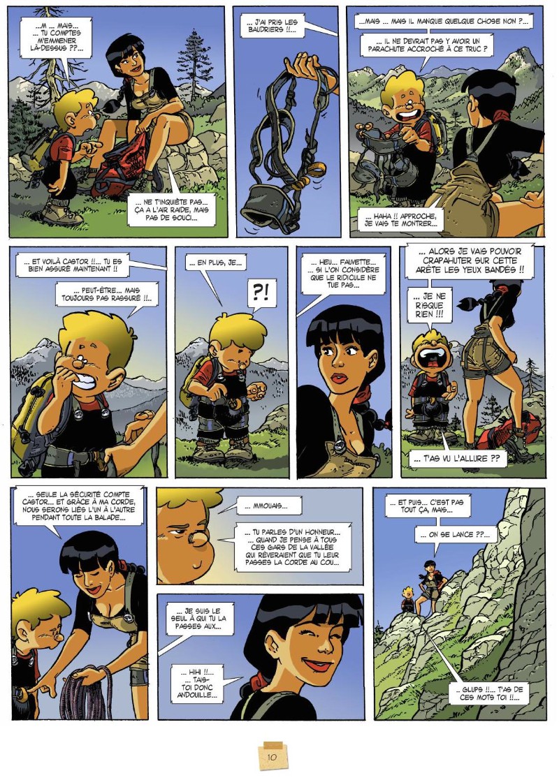 Direction le village d’Abondance, en Haute Savoie pour une mission des plus importantes. Il faut aller « faire l’inventaire de la population d’Edelweiss sur les arêtes du Mont-Chauffé ». Mais dès le stationnement, Fauvette pressent qu’il se passe quelque chose d’étrange. Elle fait l’innocente et part avec Castor à l’assaut de la montagne. En effet, que de choses étranges aperçoivent-ils. Que fait un homme armé caché? et pourquoi un autre homme escaladait en tenue de camouflage? Le plus important est de trouver les fleurs pour les compter. Seulement un bruit d’arme à feu change la donne. Il faut impérativement identifier ce qu’il s’est passé. Tout ce sport périlleux et dans l’urgence n’est absolument pas du goût de Castor. La peur et la maladresse sont ces compagnons. Qu’importe, il faut se dépêcher car les malfrats eux n’attendent jamais. Grâce aux amis de l’aventurière, elle va bloquer les voleurs grâce au pouvoir des vaches. Grâce à un travail d’équipe, les criminels seront arrêtés. Voler des oeufs de faucon pèlerin va leur coûter cher. Après tout ça, le bambin a bien le droit à un peu de repos. L’école est vraiment un lieu de détente? Il faut écouter, faire des devoirs, avoir des examens… Pourquoi ne pas essayer de s’en amuser et faire tourner en bourrique l’enseignant?