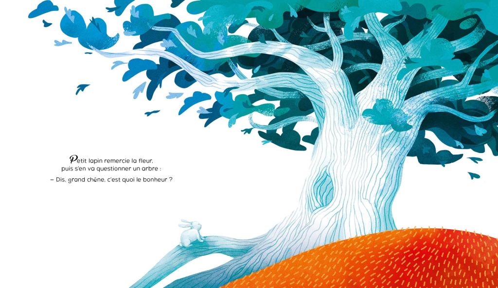 Petit lapin pose cette question aux créatures de la forêt. Pour l’oiseau, c’est de voler en liberté, pour l’ours, c’est de se régaler avec du miel tout frais, et d’autres ont des réponses différentes : s’émerveiller de la Nature, être en famille… Et pour toi, c’est quoi le bonheur ?