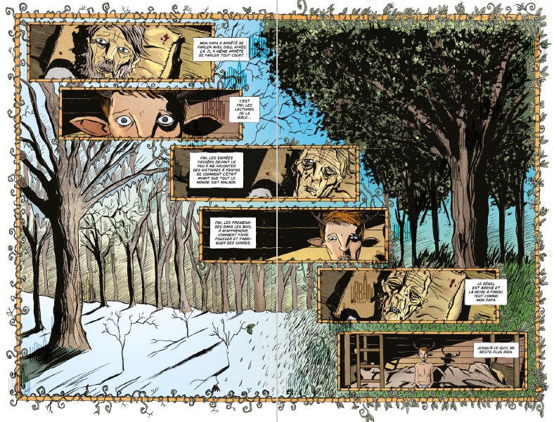 Il ne faut pas regarder la série Netflix avant de se plonger dans le comics. Déjà, cela réduit le niveau de surprises dans le récit et on s’attend parfois à ce que l’on a vu. Nous avons des biais de lecture ce qui est bien dommage. Toutefois, on se laisse prendre au jeu. Comment ne pas tomber sous le charme de Gus, cet enfant animal qui a grandit loin de toute civilisation avec son père. Malheureusement, il va devoir quitter son pré carré et le monde est d’une cruauté sans nom. Jepperd lui a menti et tellement d’autres après faut-il garder l’espoir? Ce garçon est différent et il est possible qu’il soit le premier de sa race. Pourquoi? Comment? Y a t’il vraiment un lien avec la destruction de la race humaine? Une façon très élégante de parler de virus, de cible et de contamination ciblée. L’Homme n’est-il pas capable de trouver le moyen de commettre un tel génocide? L’Histoire nous prouve le contraire. Quelque chose de plus gros se cache derrière et nous en saurons plus dans la suite. Surtout que l’on voit commencer à se constituer une révolte de ceux qui veulent changer les choses. Jepperd et Gus sont les graines de la tempête qui gronde. Le lecteur ne peut pas rester sur cette fin. L’adaptation en série a fait l’impasse sur un aspect assez lourd. Le scénariste fait sans cesse référence à la bible et ces pratiquants. En effet, cela montre l’endoctrinement, le phénomène de groupe, la pression sociale. Mais l’omniprésence étouffe un peu et cela n’est pas si nécessaire puisque l’adaptation a retiré cet aspect et cela ne manque pas. Pour l’aspect graphique, c’est dense, c’est brutal, c’est rugueux. Si vous êtes un adepte de la ligne claire, cela va piquer les yeux. Par contre, si vous êtes habitué à lire des comics, rien n’a signalé de spécifique. Un premier tome qui donne le ton et de poursuivre.