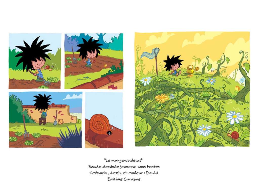 Raconter une histoire sans texte est toujours une prouesse. Les enfants sont des plus heureux car ils peuvent se plonger dans une aventure tout seul. Un livre qui leur permet de leur donner l’illusion qu’ils sont grands et autonome. En plus, Dawid leur propose un récit mignon et réflexif. Le héros qui doit avoir le même âge que le lecteur ce qui lui permet de s’identifier. Le garçonnet s’occupe avec plaisir de ces laitues qui sont magnifiques. Du moins jusqu’à l’arriver d’un oiseau qui avale toutes les couleurs de ce qu’il touche. Il faut agir et vite car c’est inadmissible. Un clin d’œil élégant écologique qui ne laissera pas les têtes blondes insensibles. Le format carré, les couleurs lumineuses, les espaces inter-cases plus important… tout est pensé pour le confort de lecture. Un petit bijou à transmettre pour faire rire, réfléchir et voyager ailleurs.