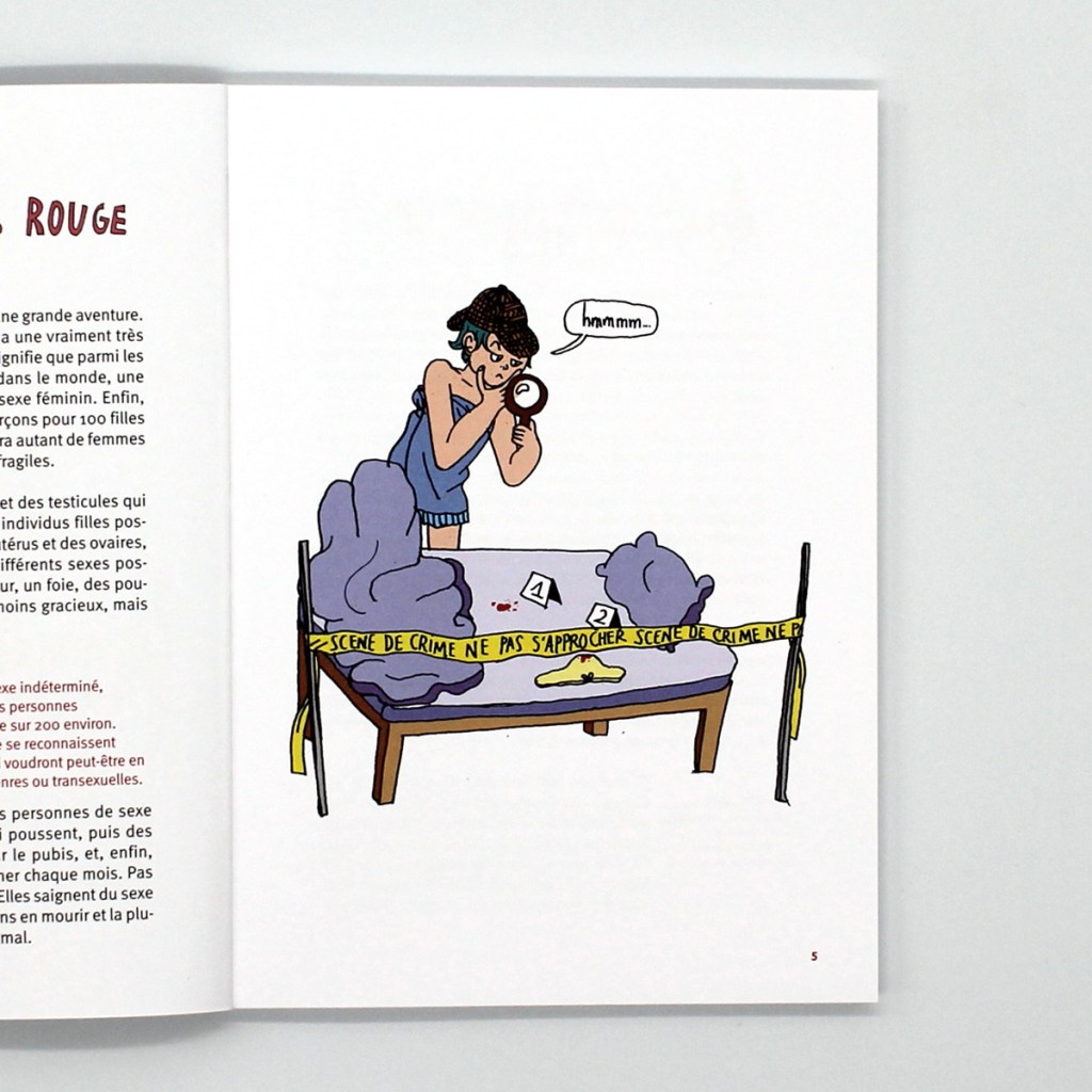 La plupart des individus qui possèdent un vagin entre 9 et 14 ans voit leur corps changer. Les règles arrivent et cela modifie tout. Mais qu’est-ce que c’est vraiment cet écoulement de sang? Quelles sont les protections hygiéniques? Quelles sont les maladies qui existent? Comment se passe une visite chez le gynécologue? Et pleins d’autres interrogations qui méritent d’être évoquées. On ne sait pas tout et c’est important de comprendre. Par conséquent, ce petit livre doit trouver sa place aussi bien sa place auprès des jeunes filles mais aussi des garçons et des adultes. On ne cesse jamais d’apprendre. En plus, les choses sont expliquées simplement, avec pédagogie et humour. Elise Thiebaut fait des références à l’étymologie, les stéréotypes, la médecine… Elle explore tous les aspects pour montrer qu’une chose aussi simple que les menstruations ont des connexions aussi bien avec la science, la société, le social, la médecine… D’ailleurs, elle souligne qu’il y faut trouver un médecin qui écoute, aide et que si ce n’est pas le cas, il faut aller ailleurs. Les règles n’ont rien d’honteux, de tabou, de secret. Chacun devrait s’informer pour moins juger, moins véhiculer des clichés éculés et plus être dans la bienveillance. A 16 ans, on doit pouvoir avoir une contraception sans avoir un jugement de type « à ton âge, tu ne devrais pas avoir de rapport sexuel ». La mise en page est efficace est un texte avec un police qui ressemble à une écriture manuscrite, un thème traité en 2/3 pages et des illustrations percutantes. A la fin, vous aurez le droit à quelques jeux pour vous amuser intelligemment. Un petit élément qui aurait été bien en bonus avec les sources des chiffres évoqués et faire un listing des numéros et sites importants surtout pour les adolescents.