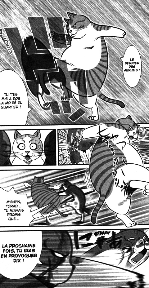 Quand on voit la couverture, on sait que l’on va aller à la rencontre de terrible félin. Et non, vous n’aurez pas de minions chatons à sa mamie. Non plus d’animaux qui vont vous charmer avec des grands yeux remplis d’émotions. Dans ce manga, c’est opération badass matou. Quand la nuit tombe, les chats de gouttière font régner la loi sur leur territoire tout en mangeant aux bons endroits. Si l’on vient remettre en cause l’ordre établi, tout risque de basculer. Hige, même s’il est l’animal le plus détesté va trouver un allié de tailler qui va remettre les pendules à l’heure de chaque boss. Les mangakas lui ont choisi un nom des plus éloquent avec Nobunaga. Celui qui a essayé d’unir le Japon pour en faire un grand pays et qui a malheureusement échoué. L’Histoire peut être réécrite surtout au niveau de chat de quartier. Bien entendu, le parallèle avec les yakusas n’aura échappé à personne. Chacun son secteur, ses spécialités et on tente parfois de dépasser la frontière pour empiéter sur l’ennemi. D’ailleurs, entre eux, ils se mettent sur leurs deux pattes arrières et montre des balafres à en effrayer plus d’un. Impossible de passer à côté car nous avons le droit à des gros plans les mettant bien en évidence. On sent l’influence cinématographique dans la mise en page. Les fans de bastons vont adorer et l’avantage est que la série est en 4 tomes.