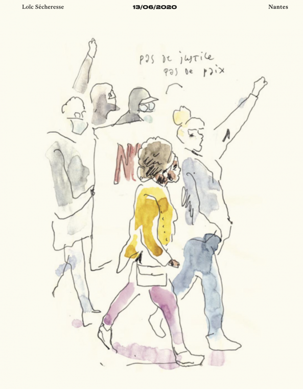 Refusant d’emblée toute position de surplomb, ils dessinent la foule, croquent des visages, dialoguent avec celles et ceux qu’ils côtoient, retranscrivent paroles et gestes. À Nantes, à Paris, à Saint-Nazaire, à la fois acteurs et témoins, ils campent les manifs climat, la mobilisation contre la réforme des retraites, les actions féministes, etc., ébauchant, sans dessein préalable, le portrait protéiforme d’une (autre) France, en marche – au pied de la lettre.