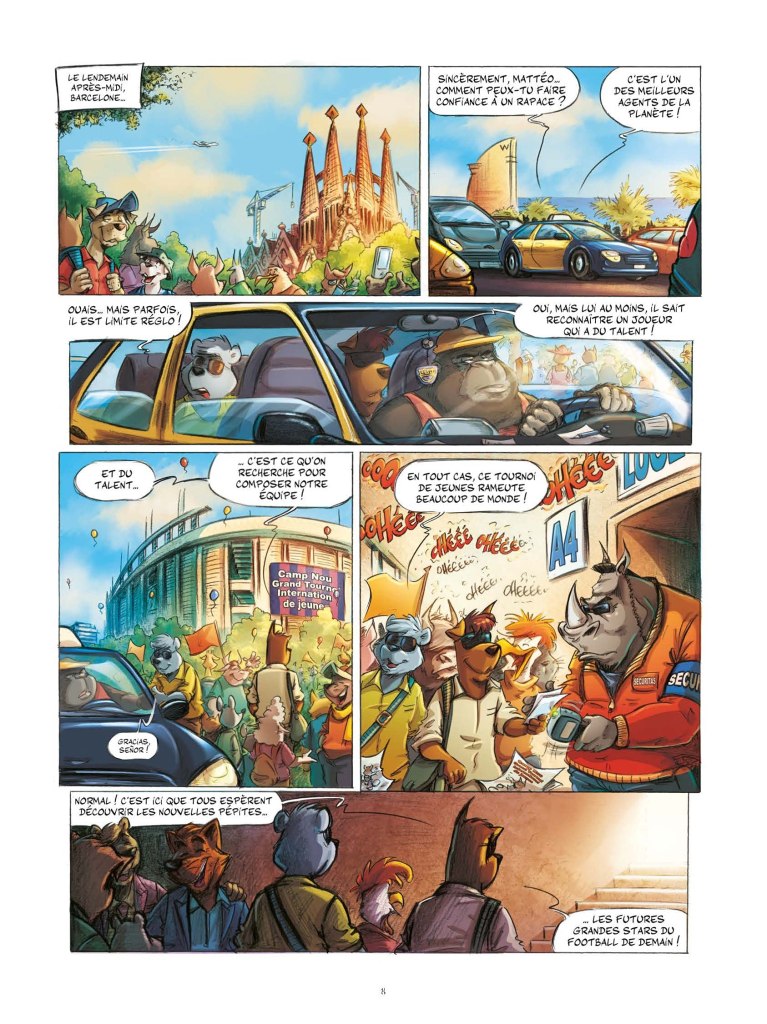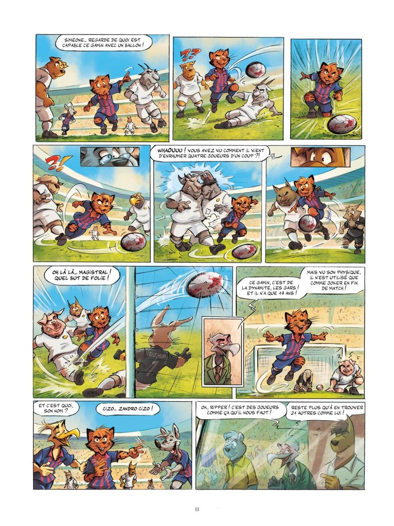 Je déteste tout ce que symbolise le football. On glorifie des individus spécifiques dans un sport collectif, à croire qu’il était seul sur le terrain pour mettre un but. Puis tout cet argent qui corrompt tout jusqu’à pousser des gens par besoin de conformisme d’acheter un vulgaire tee-shirt avec un logo et un numéro à 90€. Et enfin, les supporters bourrés en préchauffe, grossiers, agressifs que l’on a le malheur de croiser dans le métro les soirs de match. Mais quand on veut faire lire des enfants des bandes dessinée, il vaut mieux trouver un sujet qui les intéresse. Malheureusement, le foot fait partie de ces activités fédératrices et normatives pour les garçons. On trouve quelques séries comme « Lucas ». Il existe une série que j’ai découvert récemment « Cizo » qui est un véritable petit bijou. Azé choisit de parler de foot à travers le royaume des animaux. Une façon élégante de montrer la richesse et la diversité présentent dans la nature sans devoir coller à des critères sociaux définis. Un bon point pour l’ingéniosité de la démarche. Puis le scénariste parle de ceux qui jouent en force et de ceux qui simulent sur le terrain. Des pratiques qui font écho à la réalité. Ce qui fait la force et l’atout de cette ouvrage est la constitution est d’une nouvelle équipe par un ancien grand joueur pour rivaliser avec les meilleurs mondiaux. Tous les petits jeunes possèdent un don, une volonté de jouer ensemble, de partager, de se soutenir… le tout avec un regard bienveillant et positif. Cela fait plaisir de lire quelque chose qui n’incite pas à l’individualisme et au culte de l’égo dès le plus jeune âge. Même si le récit tourne principalement autour du héros Cizo, c’est inspirant, réconfortant d’avoir un personnage qui ne pense pas qu’à se regarder le nombril en clamant être le meilleur. Au niveau graphisme, on a un dessin réaliste avec une structure assez classique et des couleurs joyeuses. Un duo gagnant qui ne pourra que faire plaisir aux enfants et aux adultes aussi qui identifieront facilement les clins d’oeil à la culture ballon rond et les jeux de mots. Rien n’a été oublié, de l’entrainement aux commentateurs sportifs et cela va satisfaire les fans.