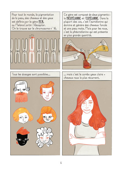 Le champ des discriminations ne manquent pas. Le besoin de conformisme incite des gens à laisser libre champ à leur cruauté, leur incivisme et leur haine. Un élément sort de l’ordinaire, cela suffit à produire un haut niveau de bêtise et d’intolérance. Charlotte Mevel a décidé de s’intéresser à un sujet qui la concerne personnellement : la rousseur. Depuis qu’elle est petite, elle subit aussi bien des violences physiques que morales à cause de la couleur de ses cheveux et de sa peau. Pourquoi une telle méchanceté juste pour une pigmentation capillaire? La naissance de son premier enfant qui est roux l’a amené à se poser de nombreuses questions. Elle propose un voyage dans le temps pour comprendre le pourquoi du comment de la stigmatisation. Et en parallèle, elle explique scientifiquement comment on devient roux et qu’elles sont les particularités biologiques. Une façon très pédagogique d’illustrer les idées reçues afin de permettre à certains de les dépasser et de ne plus les véhiculer, qu’importe leur âge. En face, la science explique que c’est un phénomène comme un autre qui s’explique logiquement. Une approche maligne et percutante qui invite à réfléchir et enrichit nos savoirs. On étoffe nos connaissances certes, mais on le fait avec un ouvrage très bien aussi au niveau du graphisme, de la mise en couleurs et de la mise en page. On se laisse porter sur ces nuances d’orange si pertinemment utilisées. Une bande dessinée intelligente (et sourcée) qui remet les pendules à l’heure pour espérer des lendemains avec moins de stupidité humaine. On a le droit de rêver.