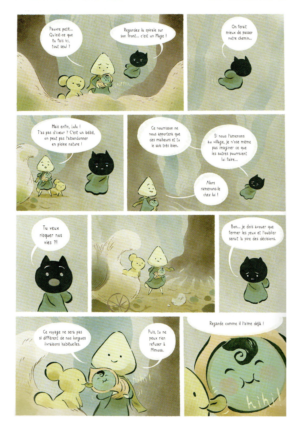 Les éditions Kinaye change de format par rapport à ces publications habituelles. Un petit format souple et peu épais qui n’est pas sans rappeler des expériences comme « Lucha libre ». La couverture n’est pas sans évoquée certaines bandes dessinées et animés japonais. On a l’impression que la nature, l’esprit de la forêt devient une source d’inspiration. Et le dessin n’a plus a être très précis, c’est la couleur qui devient l’élément important et on joue avec sa forme vaporeuse. C’est ça qui fait l’univers, la marque de la série. On se laisse prendre au jeu de suivre Fève, Lupin et Mimosa a qui il arrive de nombreux rebondissements. Yohan Sacré parle du fragile équilibre entre les zones et d’une lutte des classes qui ne dit pas son noom. Il est facile de juger sans savoir. Heureusement que le fabuleux se produit et change la donne. Notre quatuor n’est-il pas l’exception? Qu’importe ensemble ils sont plus forts. Ils ont affronté le loup et d’autres chose horrible. Les épreuves les rendent plus proche et les incident à se faire de nouveaux amis proches. Heureusement qu’à la fin, on nous donne plus d’informations sur les participants car le dessin ne les rend pas si lisible. C’est original de mettre un axolotl mais il n’était si évident malgré que j’ai déjà vue sa tête grâce à Patrick Baud. Au final, les pages se tournent assez bien même au final je ne sais pas trop ce qu’il m’en reste. C’est mignon, c’est sympa mais est-ce que je vais m’en souvenir? L’avenir nous le dira.