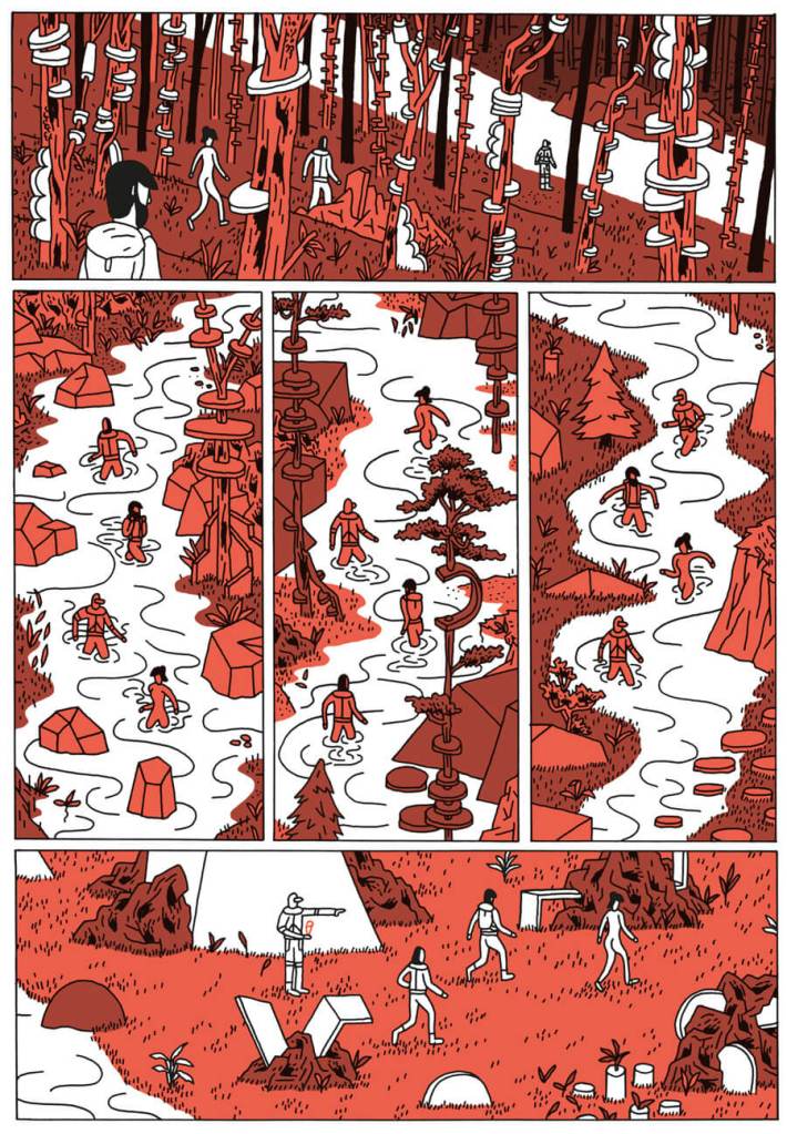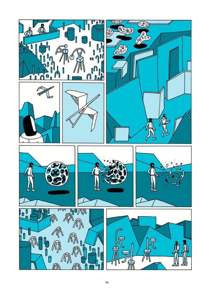 La lecture se termine sur un sentiment assez mitigé et étrange. On voit le travail fourni pour créer un tel univers qui demande beaucoup de recherche et de réflexion. Cette application se fait aussi bien au niveau du scénario que du graphisme et des couleurs. Les fans de SFFF devraient adorer car on trouve de nombreux éléments qui vont leur parler comme un vaisseau dans l’espace, le fait de repeupler de façon scientifique une planète, la vie harmonieuse entre robot et humain, la destruction par l’homme sans chercher à comprendre… Le ratio temps se modifie selon le besoin de mettre l’apprenti-sorcier au coeur d’un récit futuriste. Chaque période se caractérise par une teinte. On verra trois périodes en bichromie avec des aplats de bleu, de rouge ou de jaune. Le dessin est d’une grande netteté et d’une grande précision, les rigoristes risquent d’apprécier. Cette forme de perfection souligne le côté chimique et modifié. La cohabitation dans un monde particulier semble bien se passer car chacun s’adapte du mieux qu’il peut en sachant qu’il sera sauver à un moment ou un autre. Le happy-end n’est pas un rendez-vous. Pourquoi devrait-il l’être? Une petite lecture du rapport du Giec devrait convaincre de ce choix pertinent. Malgré de grande qualité, je ne me suis pas sentie emportée dans le récit. C’est comme si on m’avait laissé de côté. A aucun moment, on ne se sent impliqué, concerné, sensibilisé. Les pages se tournent sans aucun enthousiasme car on sait que cela ne nous mènera à rien de surprenant. On referme la bande dessinée en ce demandant juste ce que l’on va lire après pour charger son imaginaire.