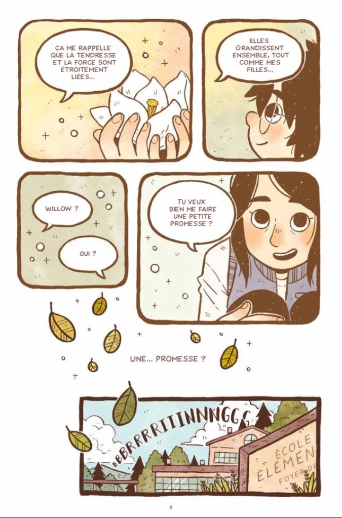 Comme à son habitude, les éditions Kinaye savent faire la différence en proposant des bandes dessinées jeunesse. Ils ne s’interdisent jamais un sujet au risque de perturber les adultes en herbe. Et quel choix judicieux qui s’est porté sur cet ouvrage à traduire. Mai K. Nguyen trouve la parfaite harmonie dans le fond et la forme pour aborder deux sujets importants avec la nature et le deuil. Comment une enfant peut-elle accepter de perdre sa mère? Elle était juste partie faire des courses, c’est tout. La mort fauche les gens simplement sans forcément une grande logique aux choses. Dans la mort d’une personne aimé, il y a toujours de la colère. Une rage envers la personne qui n’est plus présente à nos côtés, comme si elle nous avait abandonné. Et puis il y a la rage envers soi, comme si nous portions une part de responsabilité dans le choix d’un destin aléatoire. Il faut trouver des coupables. La petite fille s’en prend à sa soeur qui tente tant bien que vaille de faire tourner la maison sans sa maman. Les mots blessants sont tellement faciles à trouver et à prononcer. Un jour Willow s’enfuit dans la forêt et rencontre une dryade, Pilu. Elle aussi se sent tellement seule et invisible au milieu de ces semblables. En discutant, chacune va réfléchir à ces actions. Laisser place à ces émotions n’est pas si facile, c’est tellement fort, intense. Les thèmes graves côtoient ceux plus légers. Notre héroïne nous amène à montrer une nature d’une grande richesse, d’une grande diversité. On nous apprend à regarder, à observer et à écouter. Il faut prendre soin de la nature et de notre entourage et on nous le rendra. Les mots soignent des maux et nous permettent de nous entourer de rochers sur lesquels on s’échoue sereinement. Le graphisme et les couleurs apportent beaucoup de douceur, de réconfort. C’est une vraie délectation de tourner les pages pour s’en prendre plein les yeux. Un travail tout en finesse, d’une grande précision qui ne peut que plaire aux petits et aux grands.
