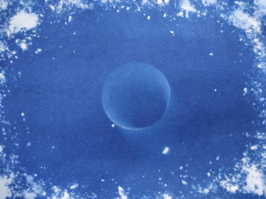 Je partage ma première création en cyanotype avec une forme géométrique. Derrière la Lune, se cache un rouleau de scotch.